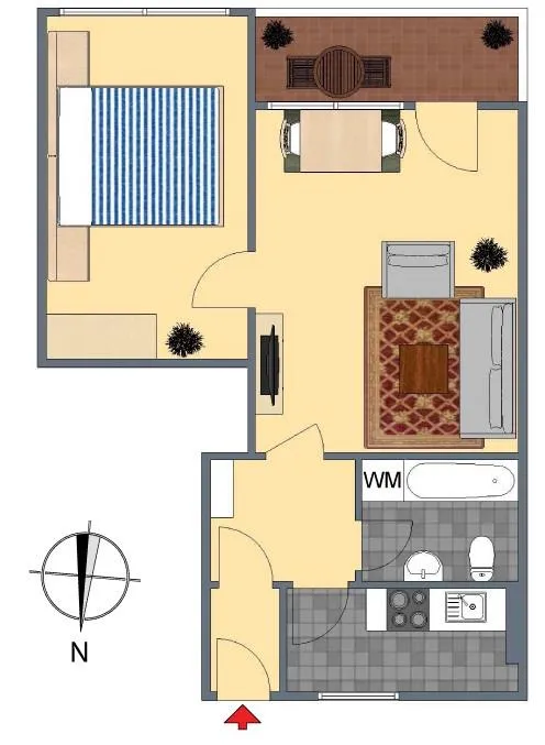 Die Zimmer und der Balkon sind nach Süden (zum Innenhof) ausgerichtet.