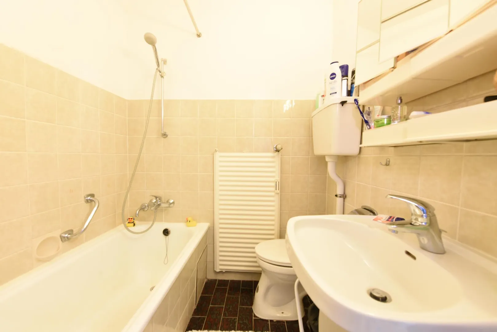 Das halbhoch geflieste Badezimmer ist mit einer Wanne, einem Waschbecken, einem Spiegelschrank sowie einem WC ausgestattet.