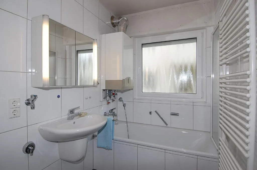 Das neuwertige Badezimmer ist raumhoch gefliest und mit Fliesenboden, Badewanne, Handtuchhalter-Heizkörper, Waschmaschinenanschluss und Fenster ausgestattet.