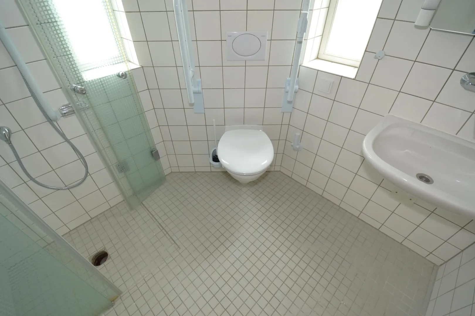 Das raumhoch geflieste Badezimmer mit Fenster verfügt über eine bodentiefe Dusche sowie ein WC und ist von zwei Zimmern zugänglich.