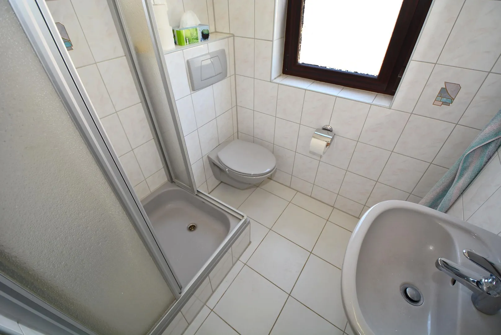 Das raumhoch geflieste Tageslicht-Badezimmer wurde ca. 2005 modernisiert und verfügt über eine Dusche, eine Waschbecken mit Spiegelschrank, ein WC sowie einen Handtuchheizkörper.