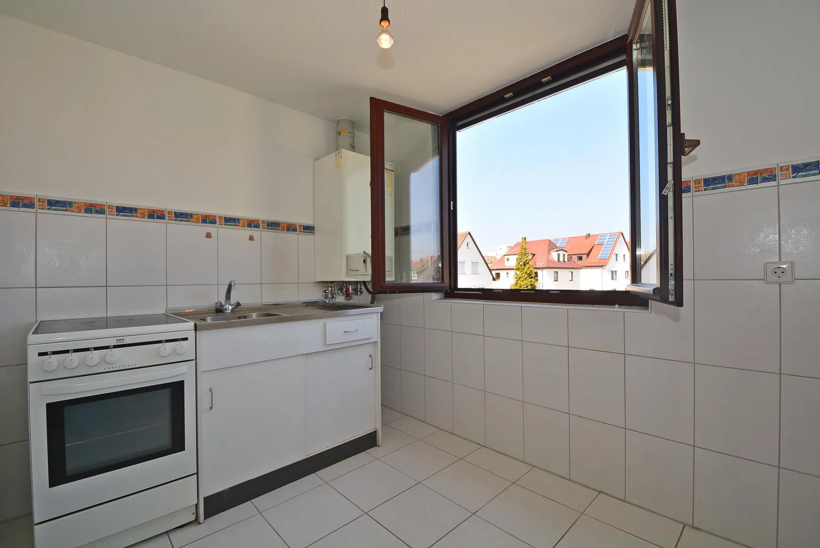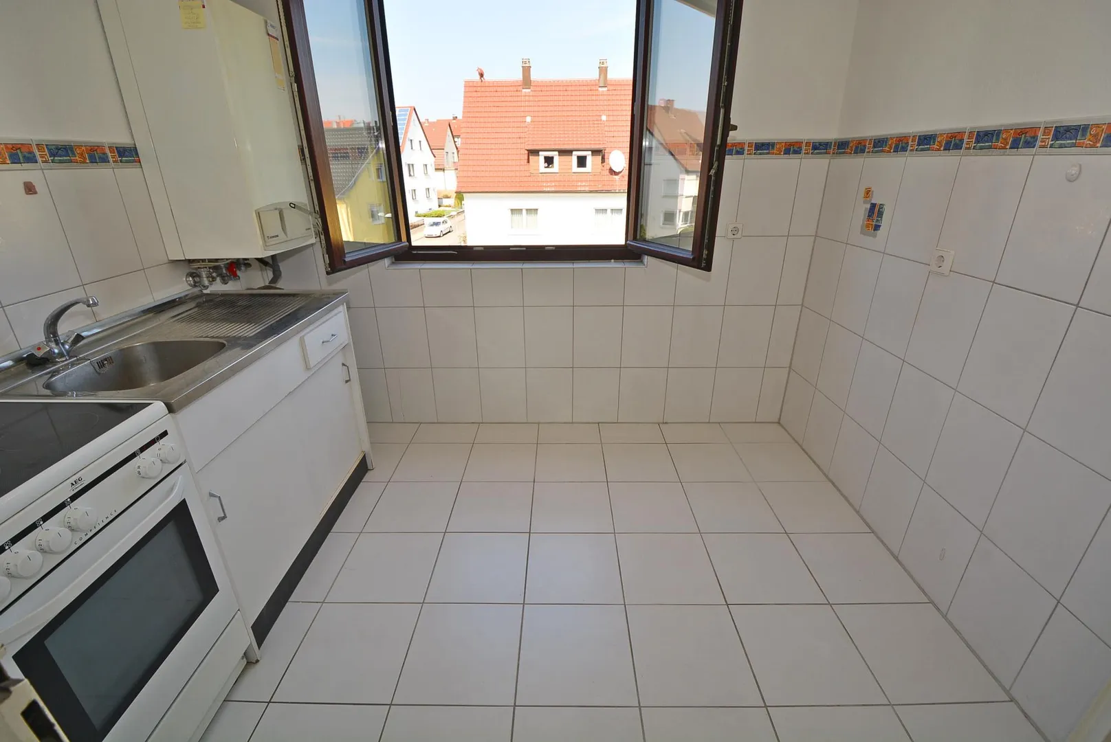 Die Küche ist mit einer kleinen Küchenzeile ausgestattet. Die Küchenzeile beinhaltet eine Spüle mit Unterschrank sowie einen Ceran-Herd mit Backofen. Platz für eine Spülmaschine ist nicht vorhanden. Alternativ kann auf eigene Kosten eine eigene Einbauküche eingebaut werden.