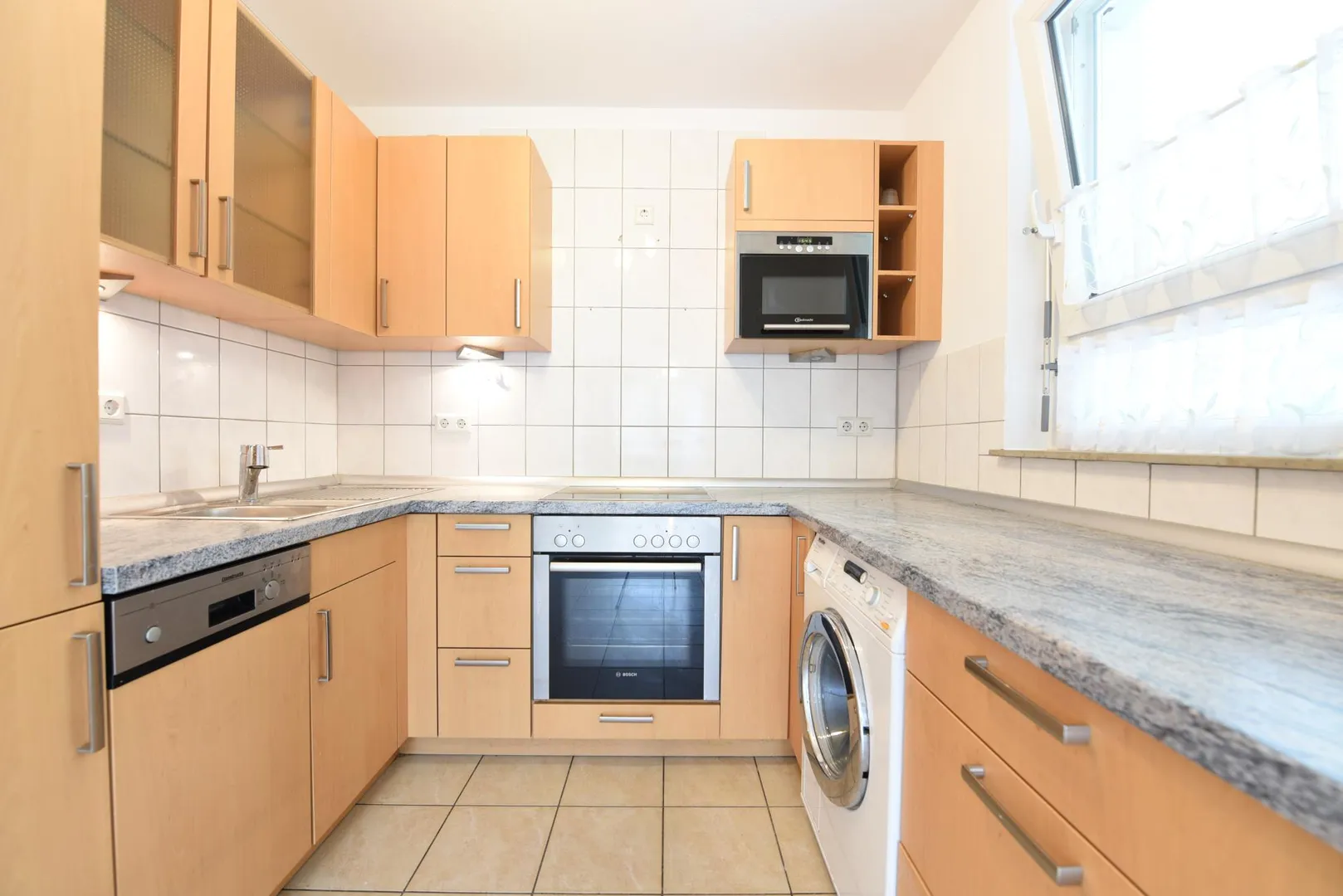 Die Küche mit Einbauküche ist zum Wohnzimmer hin offen. Die Einbauküche ist ausgestattet mit Kühlschrank, Gefrierschrank, Spülmaschine, Herd mit Backofen, Mikrowelle, Dunstabzugshaube, Unter- und Oberschränken. Eine Waschmaschine ist ebenfalls in der Küche integriert, welche bei Bedarf auch im Waschraum abgestellt werden kann. Die Elektro-Geräte sind funktionsfähig. Für die künftige Funktionsfähigkeit der E-Geräte übernimmt der Vermieter keine Haftung.