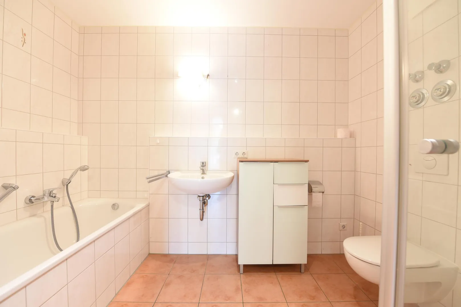 Das raumhoch geflieste Badezimmer ist ausgestattet mit einer Badewanne, einer Dusche sowie einem WC.
