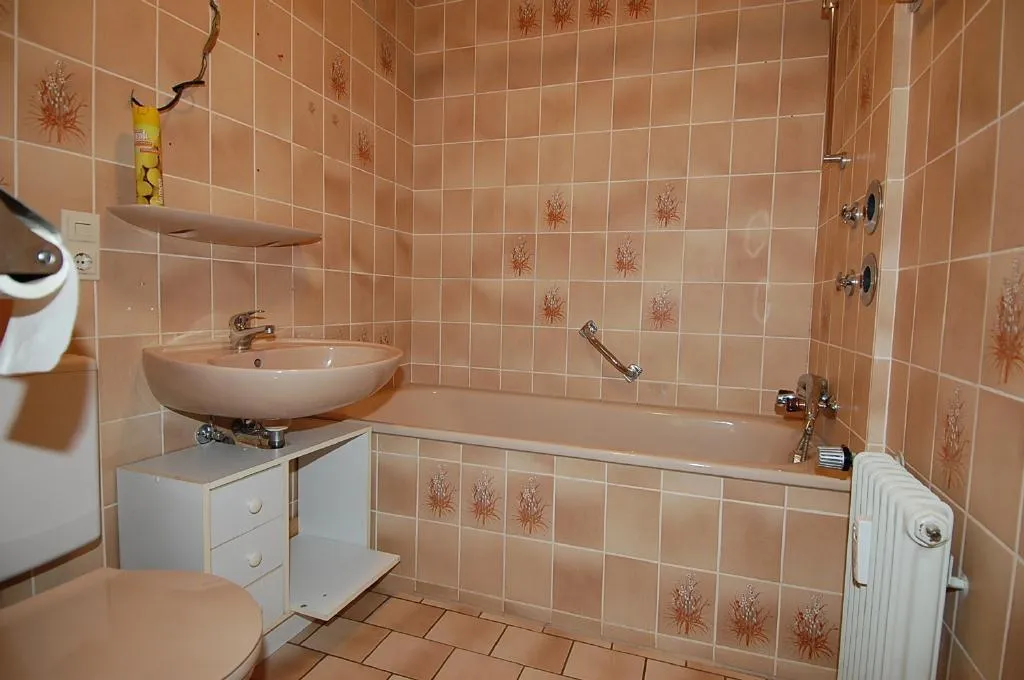 Das Badezimmer ist raumhoch gefliest und mit einem Fliesenboden, einer Wanne, einem Waschbecken, einem WC und dem Zugang zum Abstellraum ausgestattet.