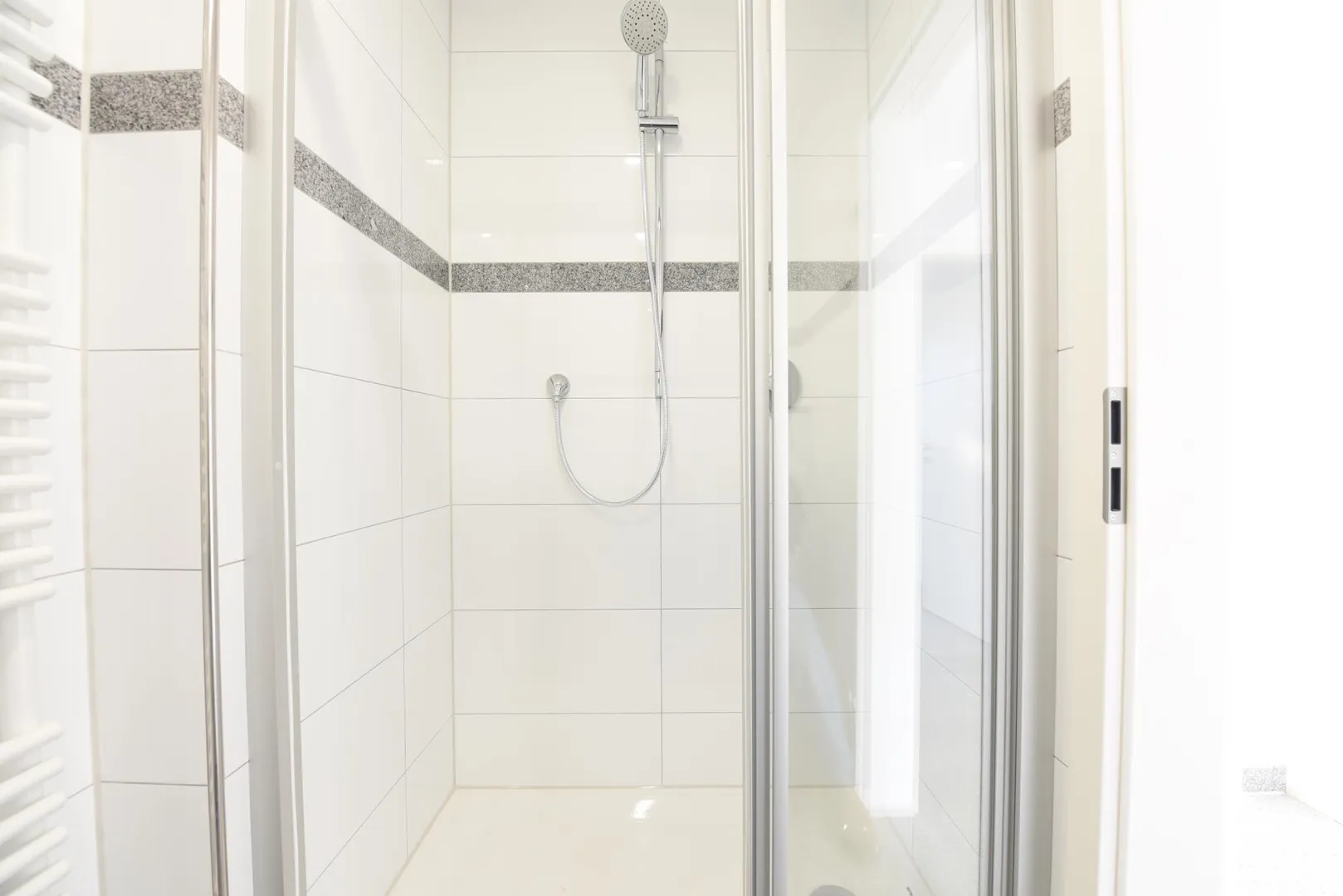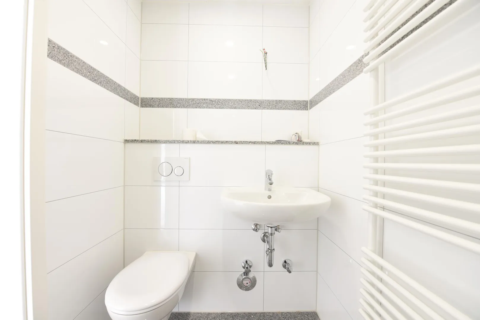 Das raumhoch geflieste Badezimmer ist mit einer Dusche, einem WC sowie einem Handtuch-Heizkörper ausgestattet.
