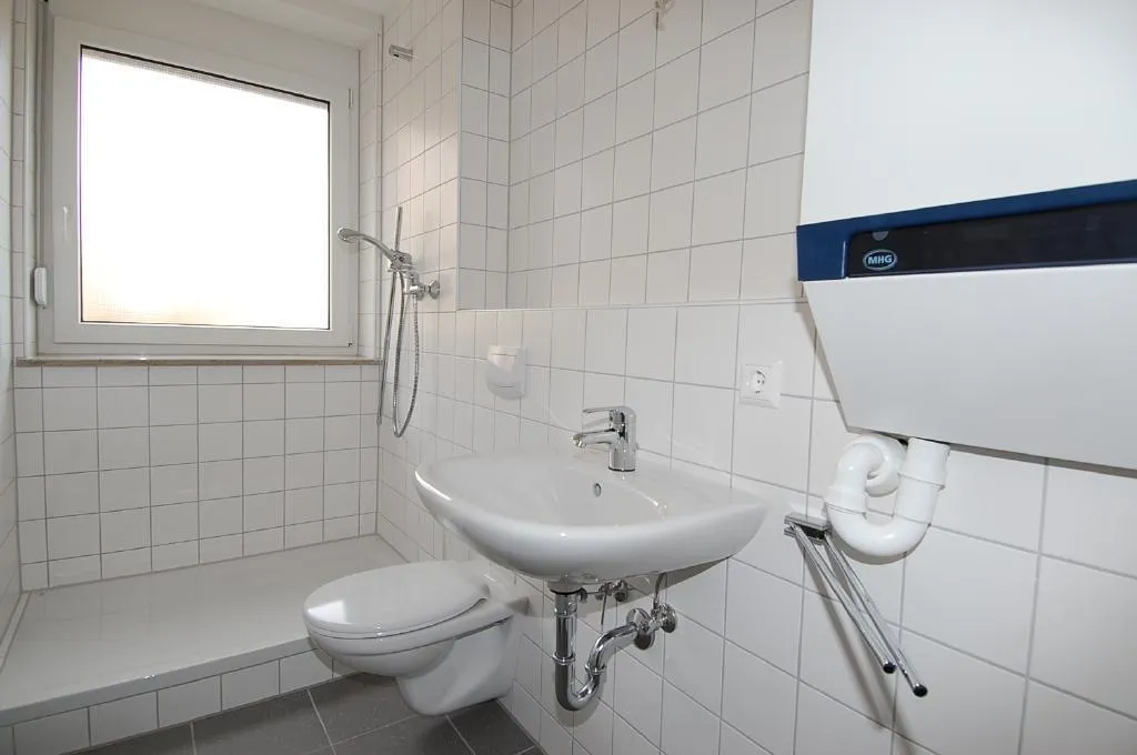 Das Bad ist raumhoch gefliest und mit Fenster, Dusche und WC ausgestattet.