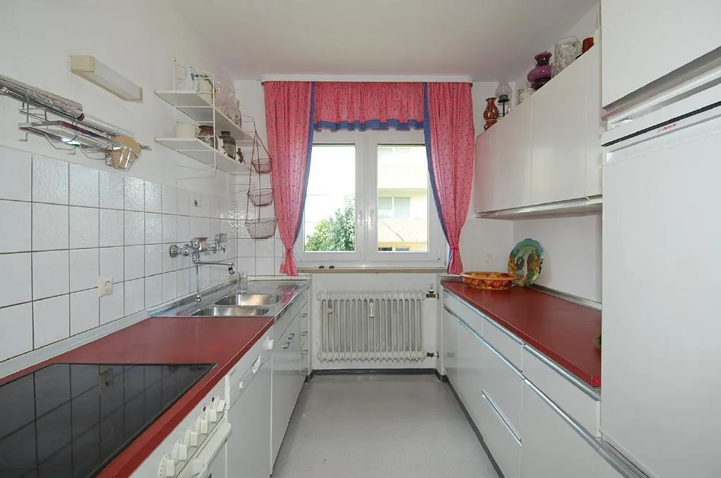 In der Küche ist eine ältere aber dennoch funktionelle Einbauküche vorhanden. Diese verfügt unter anderem über: Cerankochfeld und Backofen, Kühl-/Gefrierschrank, Geschirrspülmaschine, Spüle sowie Ober- und Unterschränke.
