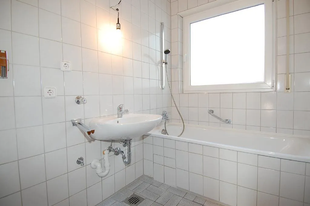 Das Tageslicht-Badezimmer ist raumhoch gefliest. Es ist ausgestattet mit einer Wanne und einem Waschmaschinenanschluß.
