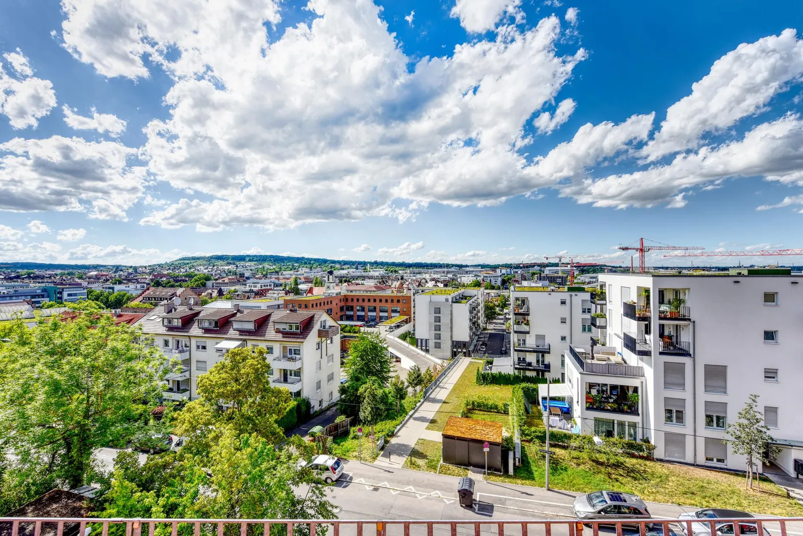 Das Wohnzimmer ist nach Westen ausgerichtet und verfügt über einen Fernblick über Feuerbach.