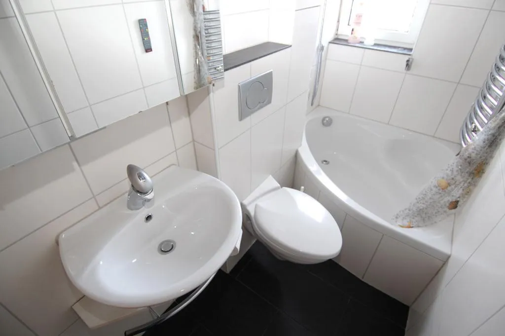 Das raumhoch geflieste Badezimmer mit Fenster ist ausgestattet mit einer kleinen Wanne, einem Handtuchheizkörper, einem Spiegelschrank und einem Fernseher.