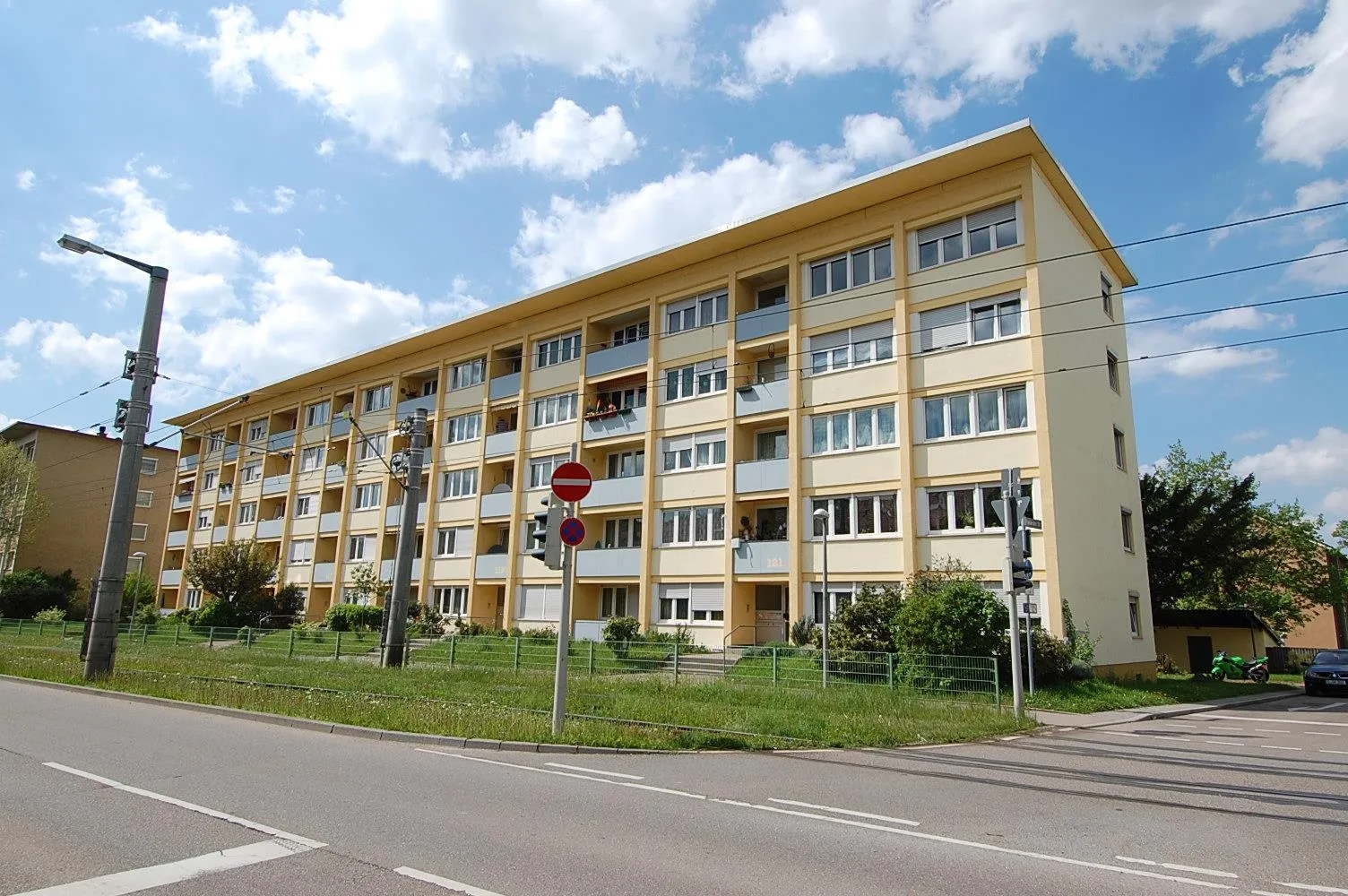 Die Wohnung befindet sich an einer Hauptstraße mit Geschäften, Stadtbahn und Bus vor der Tür.
