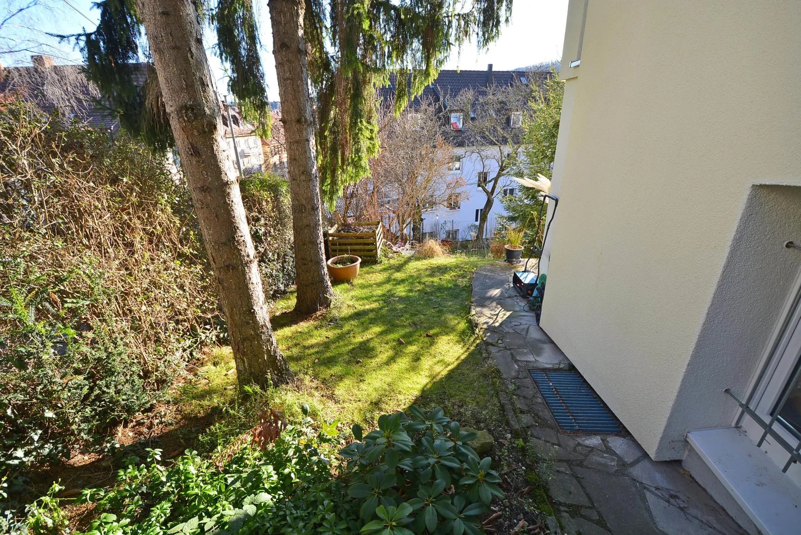 Die Gartenfläche (Sondernutzungsrecht) besteht aus Rasen und schräger Hangfläche, die aktuell mit Ziersträuchern bepflanzt ist.