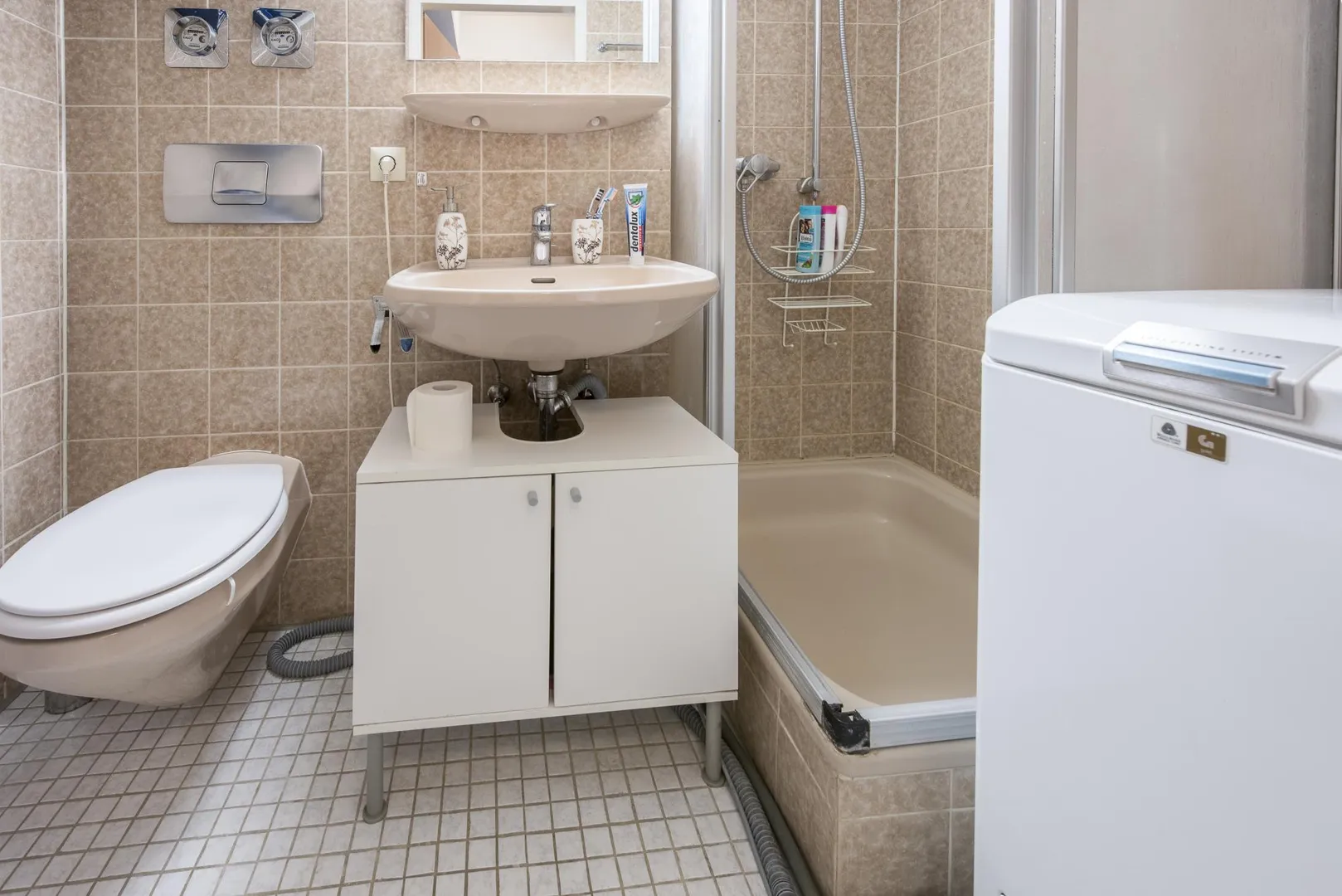 Das 2/3-hoch geflieste Badezimmer ist ausgestattet mit einer Dusche, einem WC und einem Waschmaschinenanschluss.