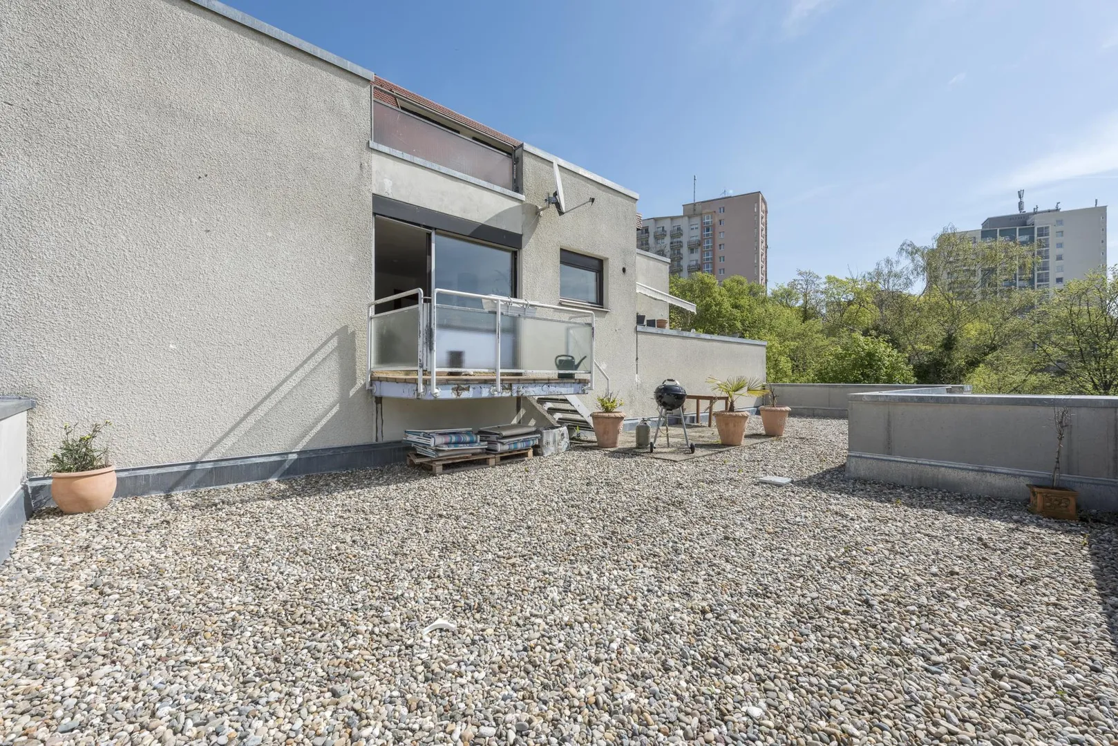 Der ca. 4 m² große Balkon und die ca. 10 m² große Terrasse sind über das Wohnzimmer begehbar. Die Wohnung, der Balkon und die Terrasse sind nach Süden ausgerichtet.