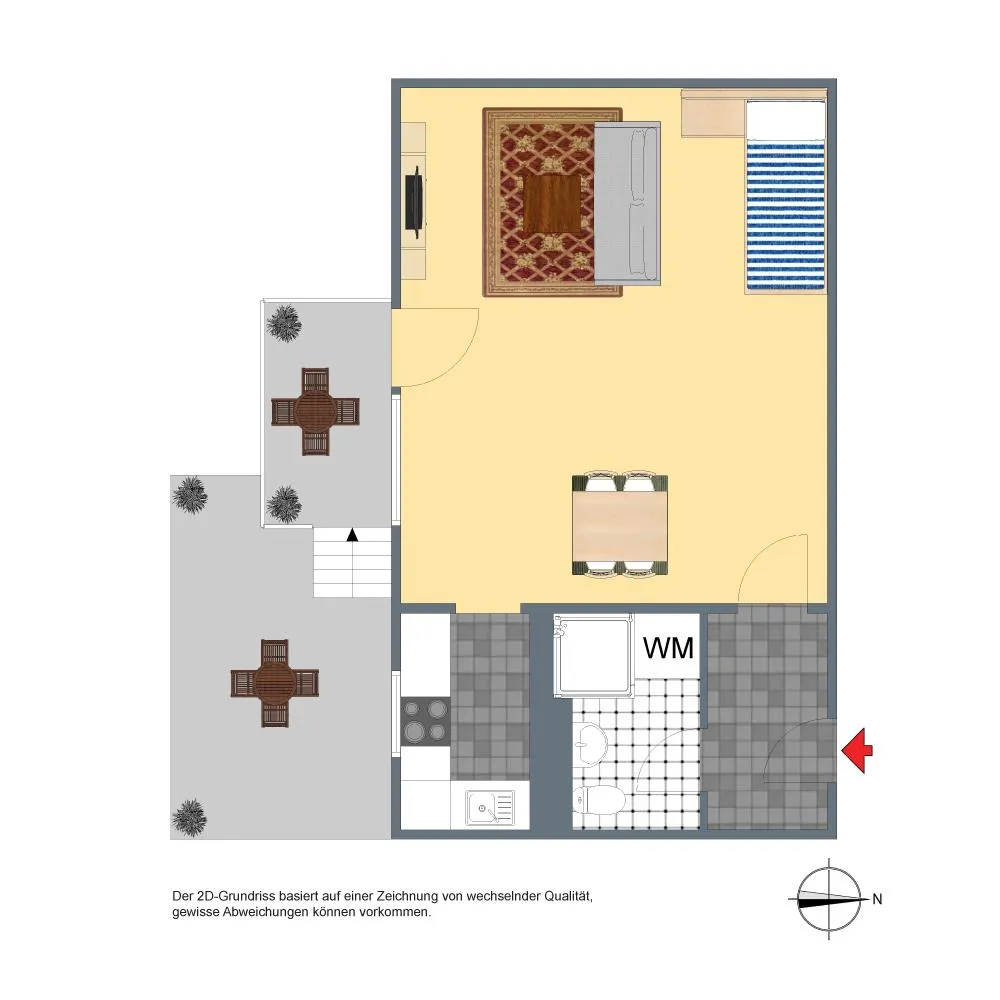 Diese helle 1-Zimmer-Wohnung mit Balkon & Terrasse befindet sich im Erdgeschoss von der Hauseingangsseite und im Obergeschoss von der Terrassenseite.