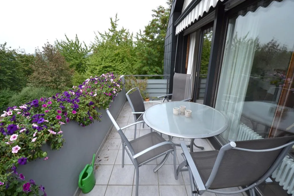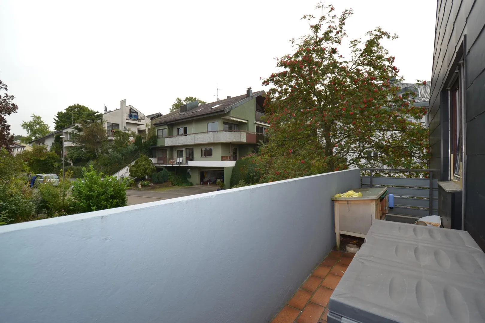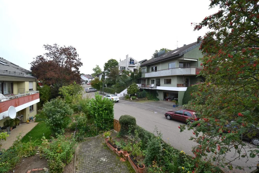 Der ca. 10 m² große West-Balkon ist über den Wohnbereich begehbar. Der Balkon ist mit einer Markise ausgestattet und verfügt über einen Blick ins Grüne im Frühling und Sommer sowie einen Fernblick zu den Weinbergen und zum Neckar im Herbst und im Winter.