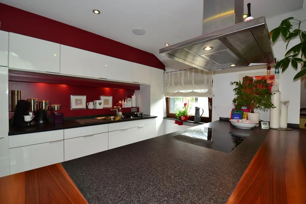 2006 wurde die hochwertige Leicht-Einbauküche mit Kochinsel eingebaut. Die Einbauküche ist ausgestattet mit weißen Hochglanzfronten, eingebauter Mikrowelle, eingebautem Backofen auf Arbeitshöhe, Induktions-Kochfeld, Spülmaschine, Abzugshaube nach außen sowie Kühlschrank mit Gefrierfach. Die E-Geräte sind hochwertig und funktionsfähig. Für die künftige Funktionsfähigkeit der E-Geräte übernimmt der Vermieter keine Haftung.