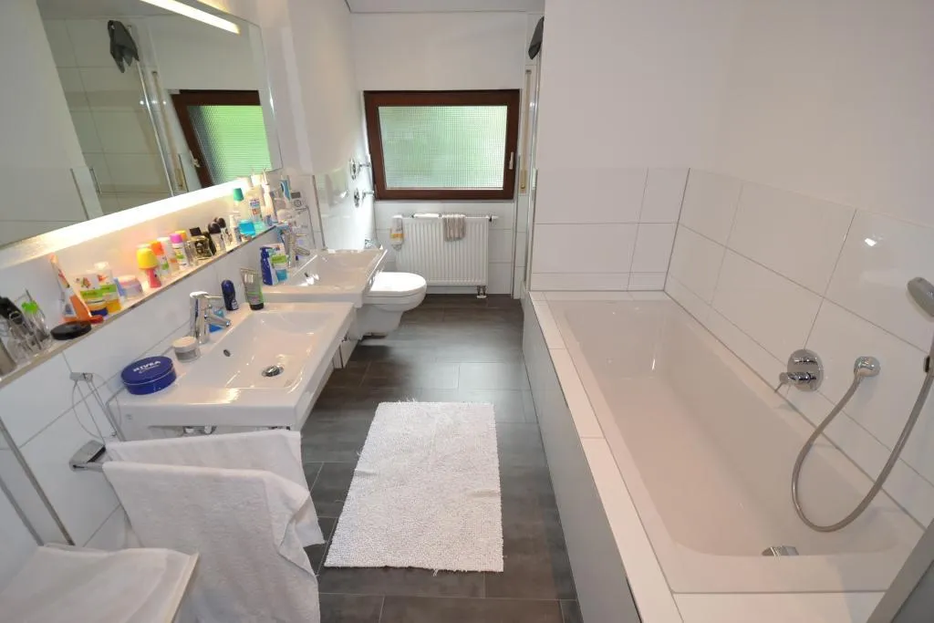 Das halbhoch gefliest Badezimmer ist ausgestattet mit einer Wanne, einer Dusche, einem WC, zwei Waschbecken, einem Waschmaschinenanschluss sowie mit einem Spiegel mit Beleuchtung.