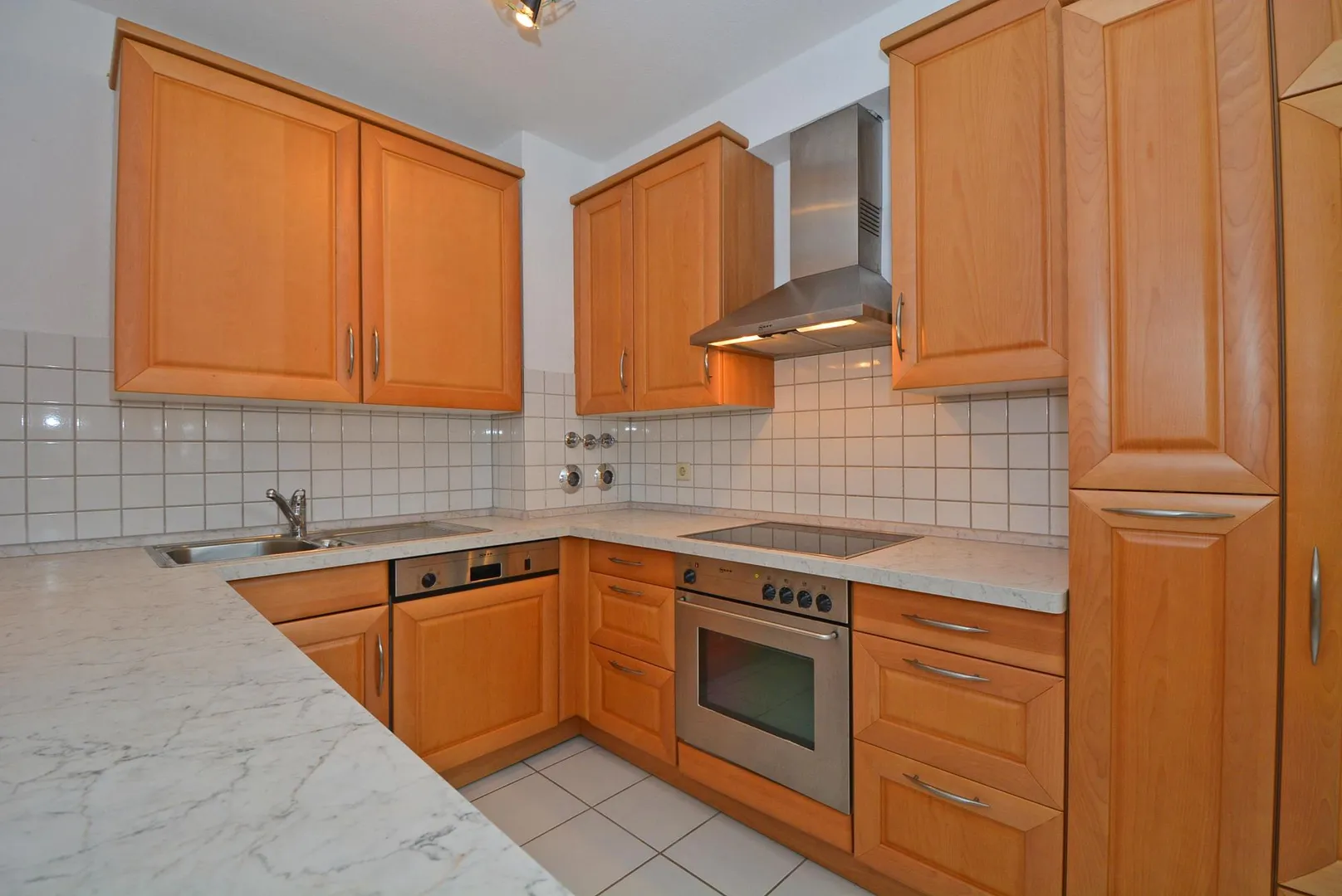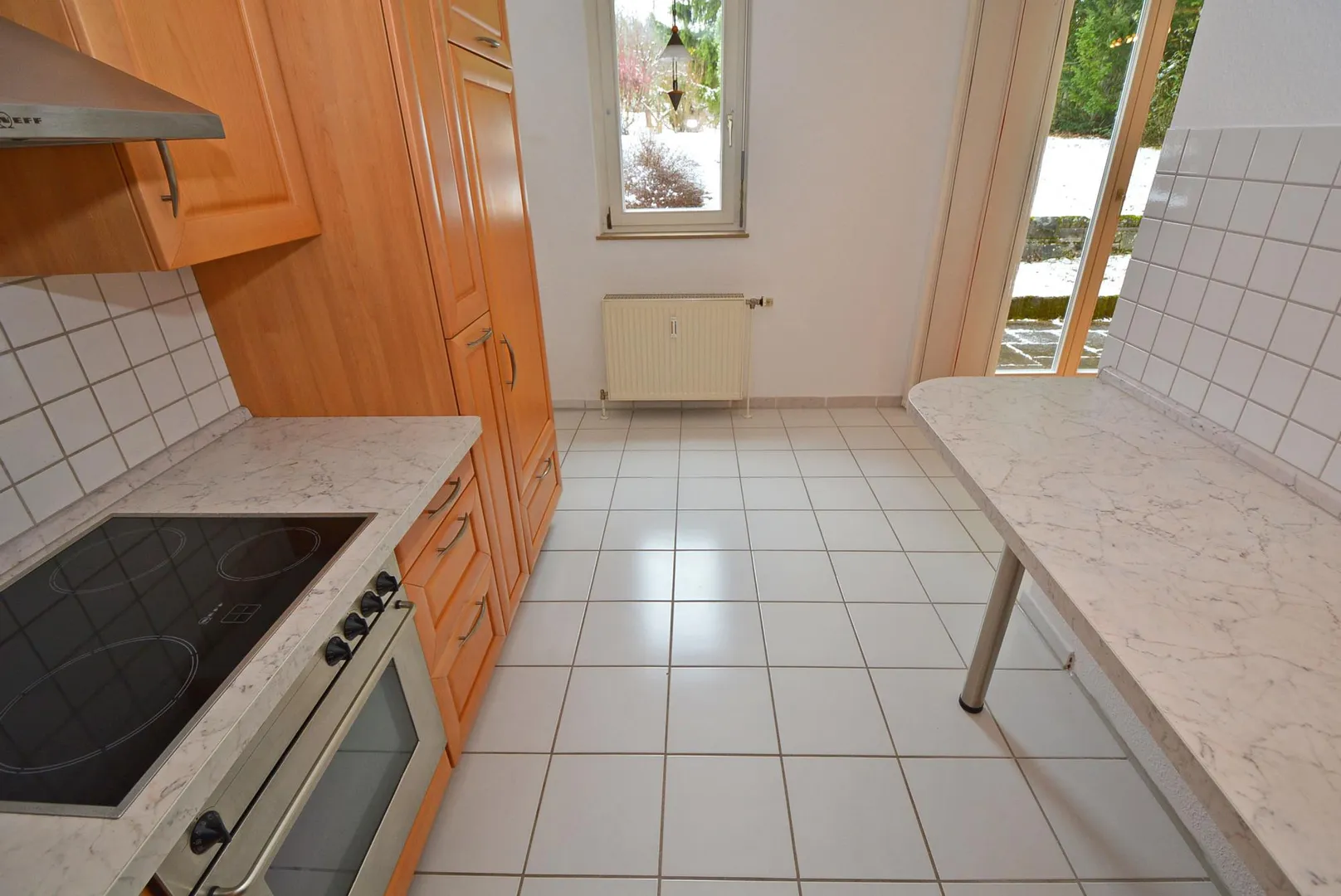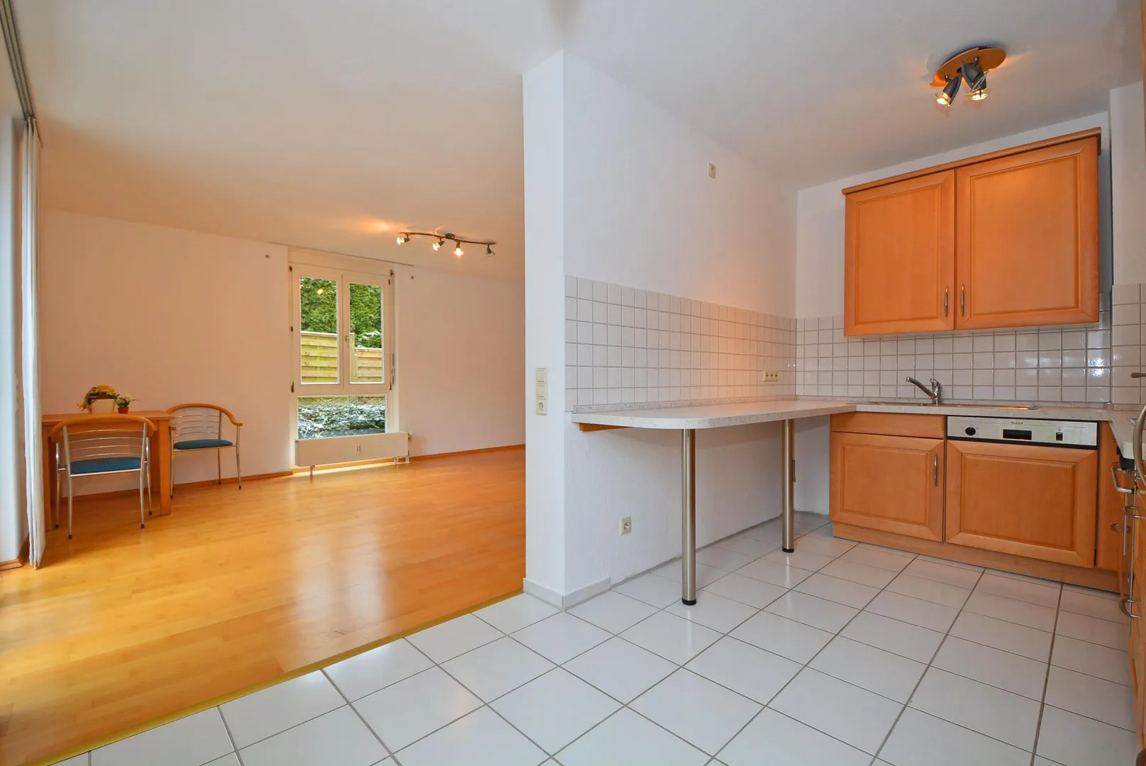 Die offene Küche ist mit einer hochwertigen Einbauküche ausgestattet. Die Einbauküche beinhaltet einen Kühl- und Gefrierschrank, einen Herd mit Dunstabzug nach außen, einen Backofen, eine Spülmaschine sowie Ober- und Unterschränke.