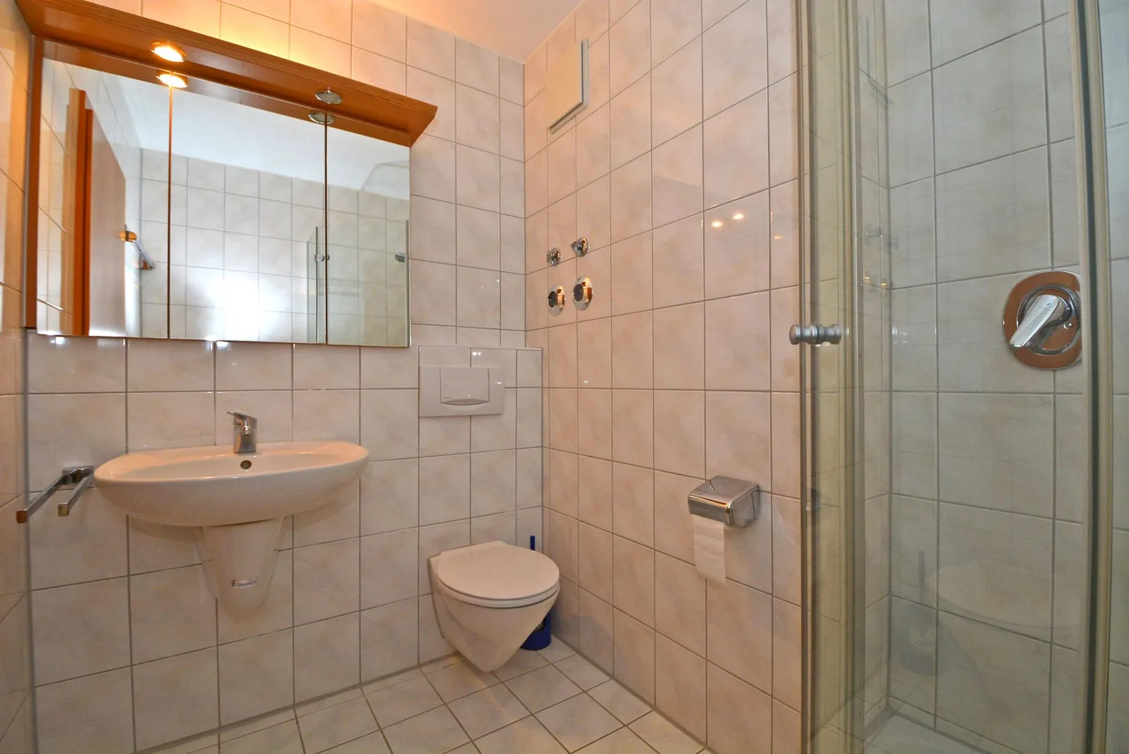 Das Badezimmer ist raumhoch gefliest und mit einer Dusche, einem WC sowie einem Spiegelschrank ausgestattet.