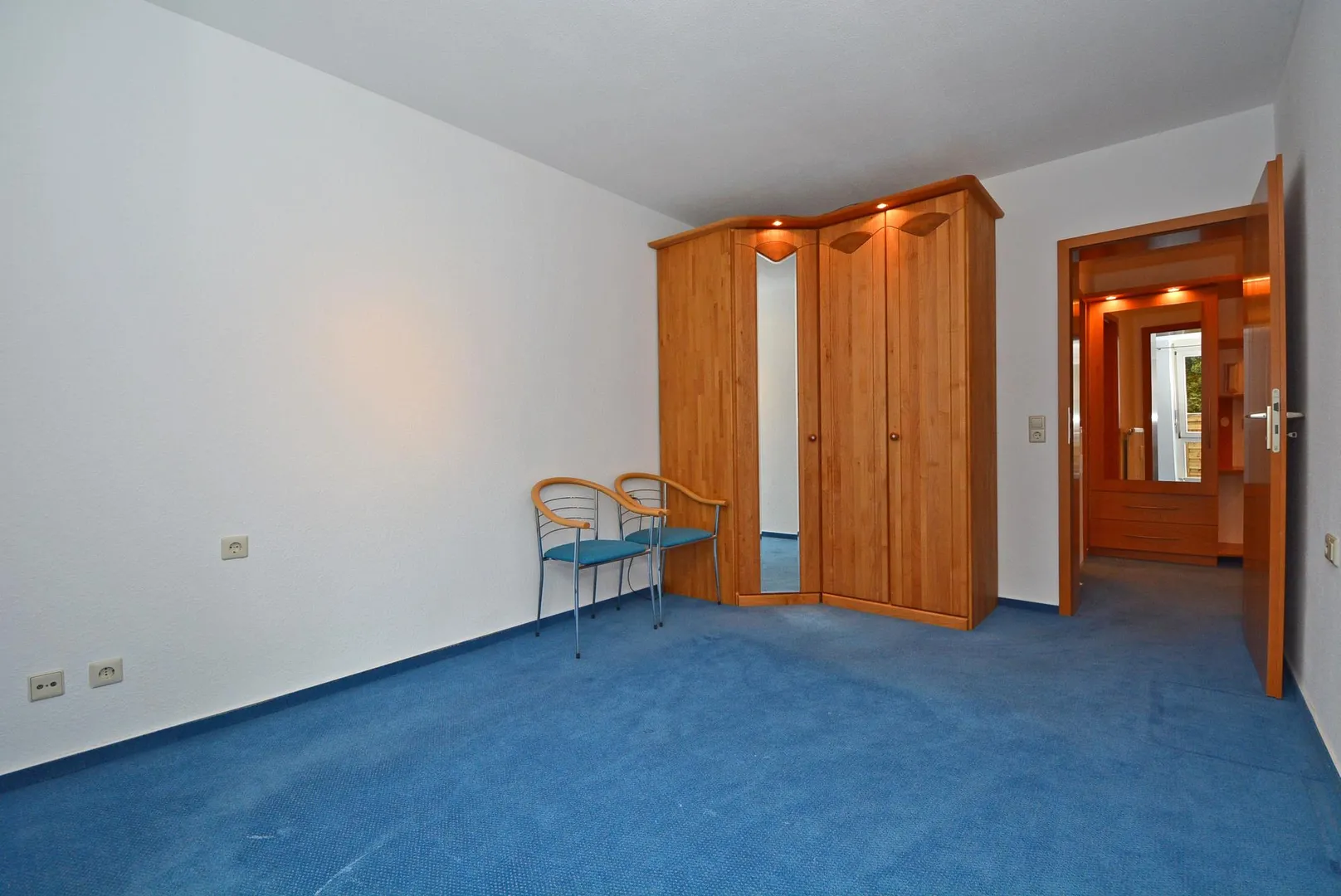 Im Schlafzimmer befindet sich ein praktischer Eck-Kleiderschrank. Im Flur befindet sich eine Garderobe.
