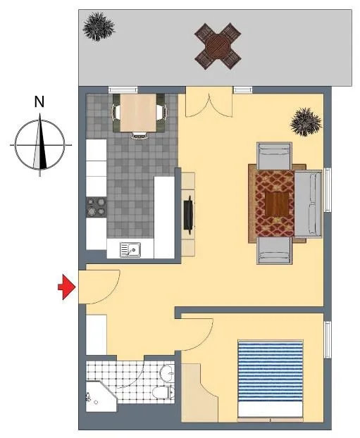 Das Wohn- und Esszimmer sowie die offene Küche sind nach Nordosten ausgerichtet. Das Schlafzimmer ist nach Osten ausgerichtet.