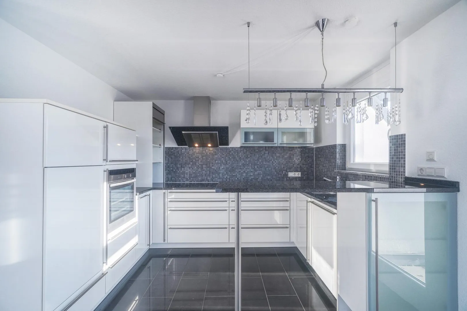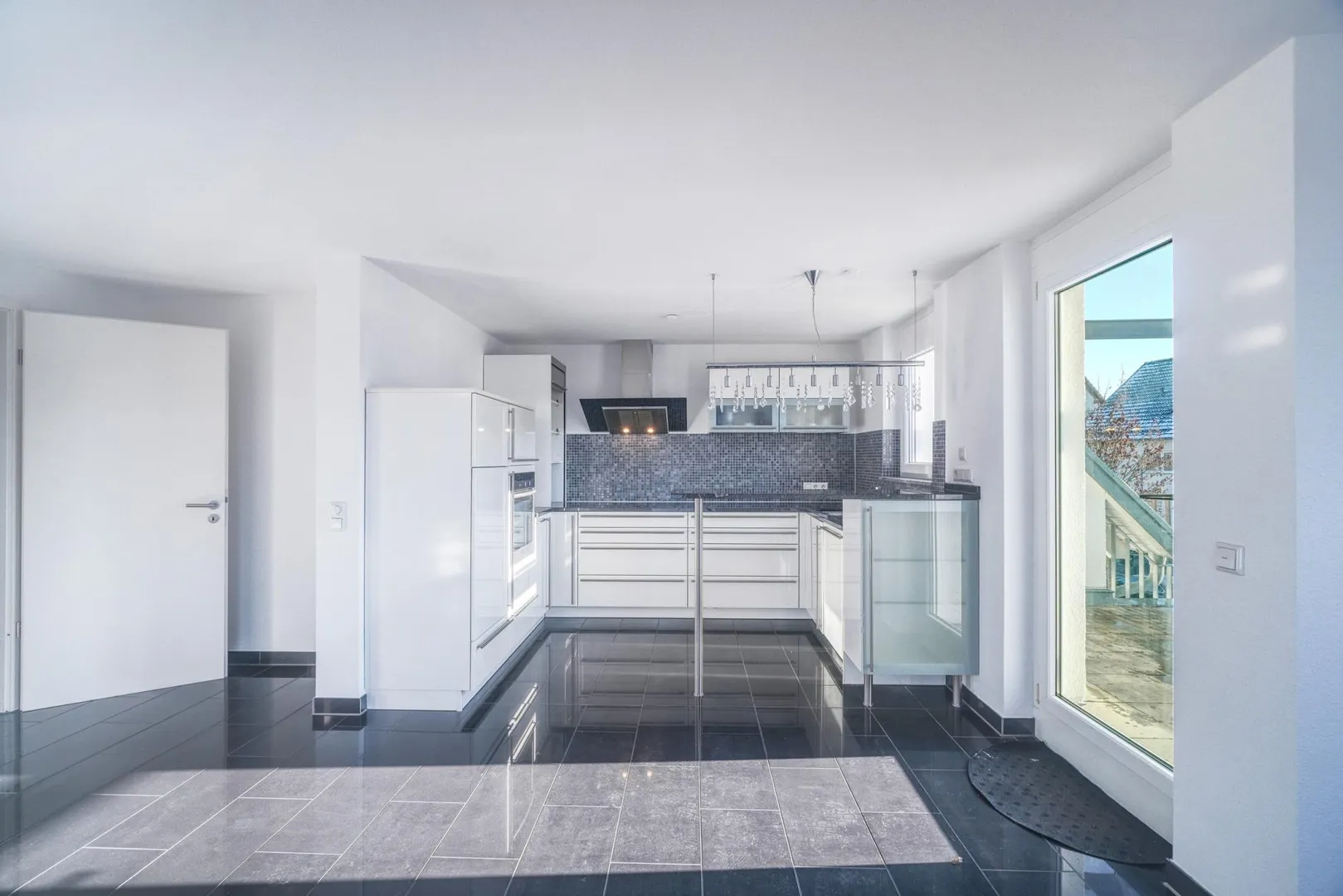 Die offene Küche ist mit einer Einbauküche mit weißen Hochglanzfronten ausgestattet.