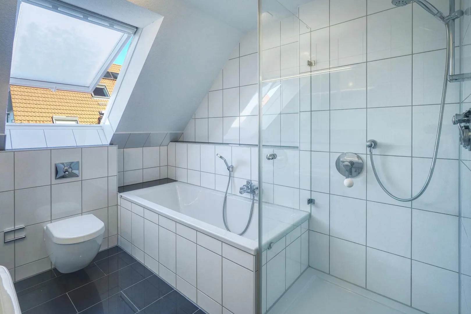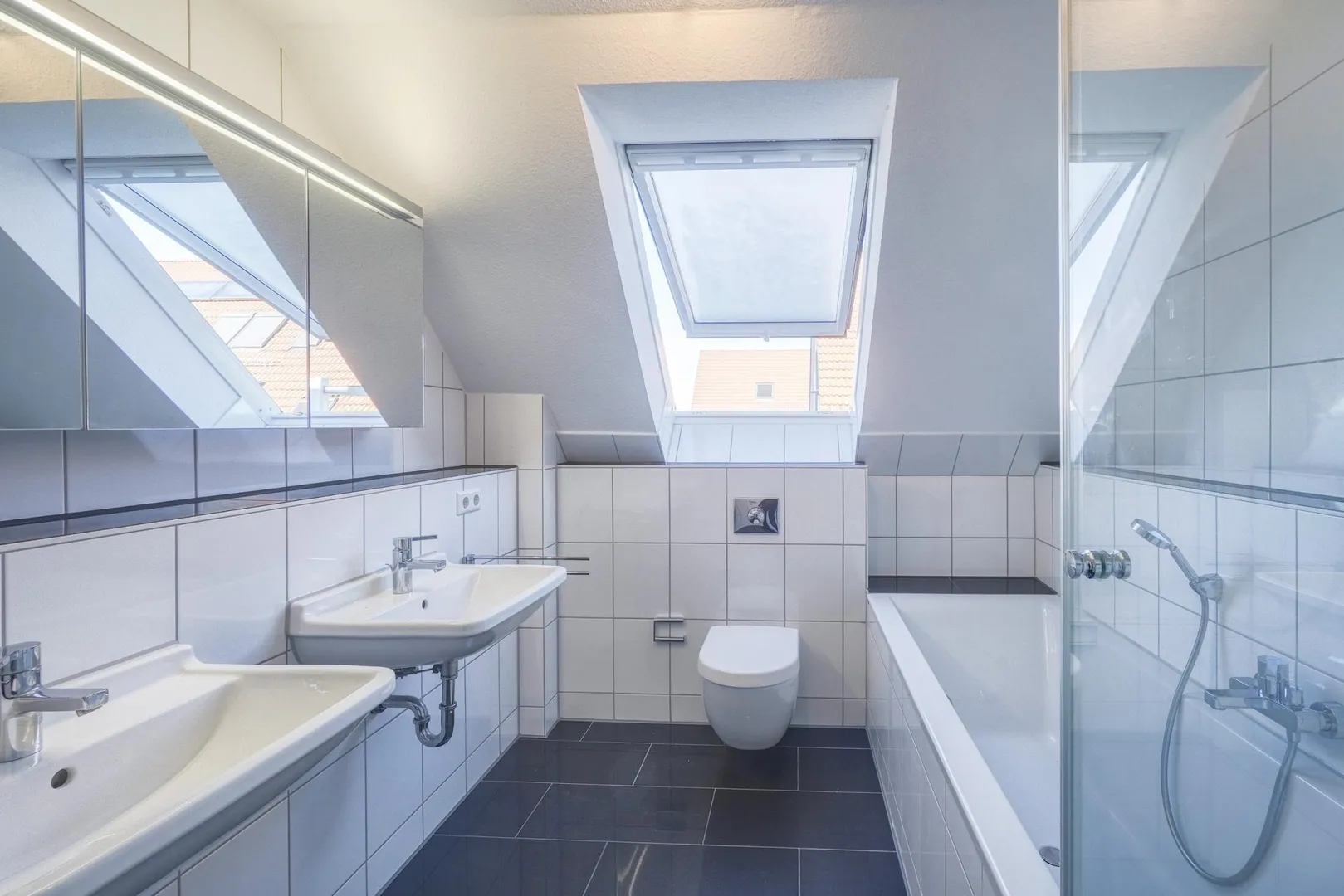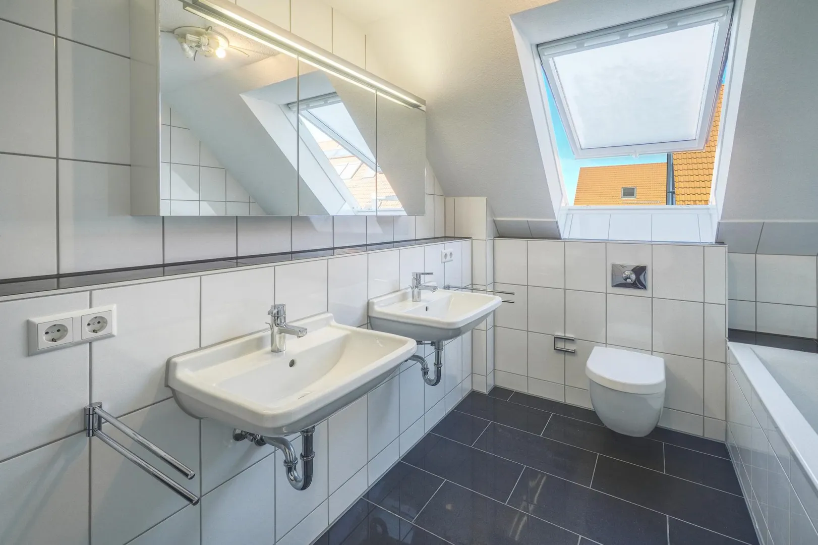 Das raumhoch geflieste Badezimmer ist ausgestattet mit einer Badewanne, einer Dusche, einem WC, zwei Waschbecken sowie einem Spiegelschrank.