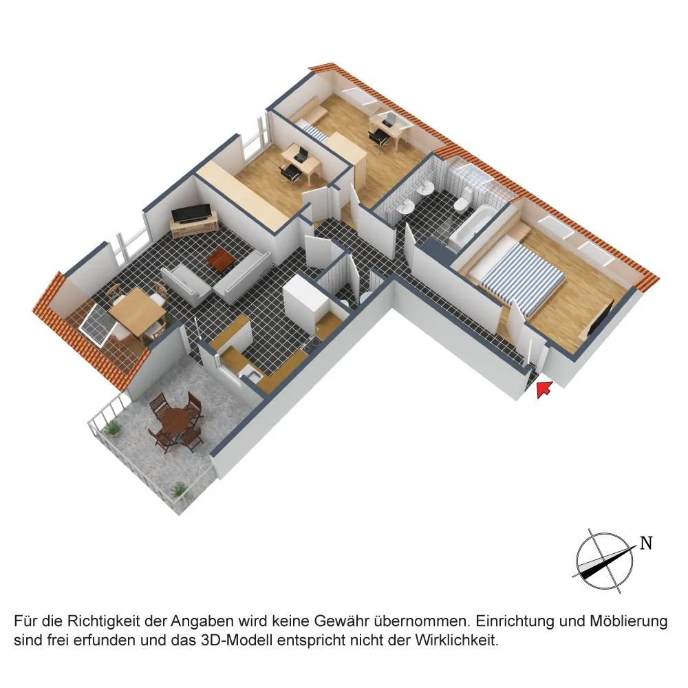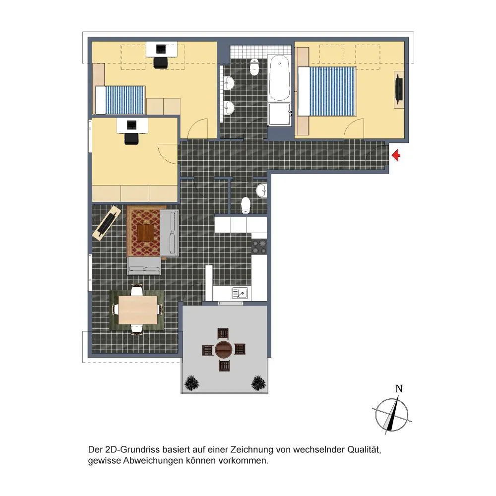 Der Grundriss der Wohnung ist sehr gut: bis auf die Küche sind alle Räume direkt vom Flur begehbar; die Küche ist zum Wohnbereich hin offen. Die ca. 10 m² große Süd-Terrasse ist ausgestattet mit einer elektrischen Markise und ist über das Wohnzimmer begehbar. Das Badezimmer mit WC verfügt über ein Fenster; das zweite WC ist separat.