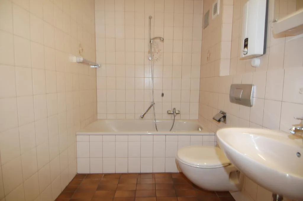 Das Badezimmer ist raumhoch gefliest und mit einer Badewanne ausgestattet.