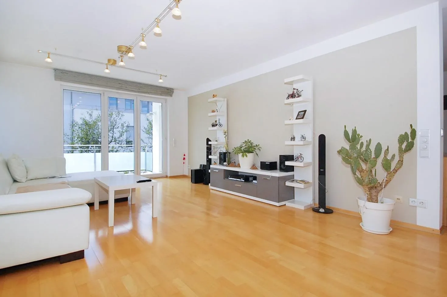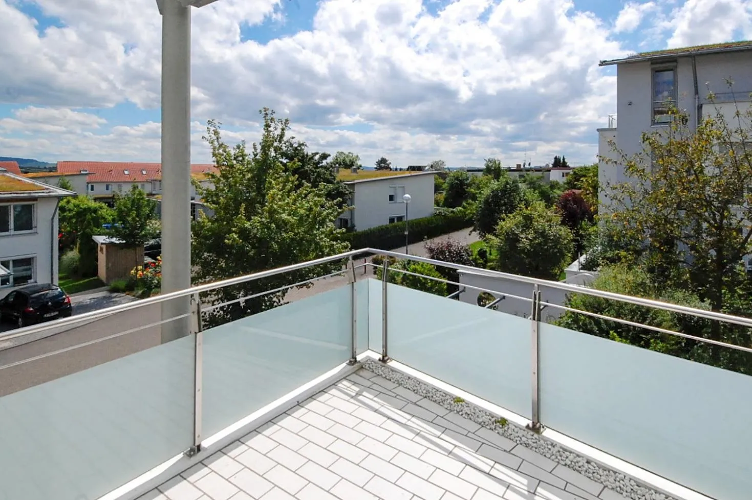 Der ca. 8 m² große Süd-West Balkon ist teilüberdacht. Er ist vom Wohn- und Arbeitszimmer begehbar.