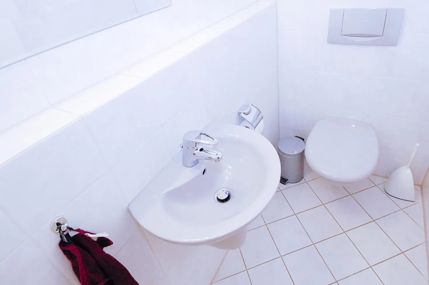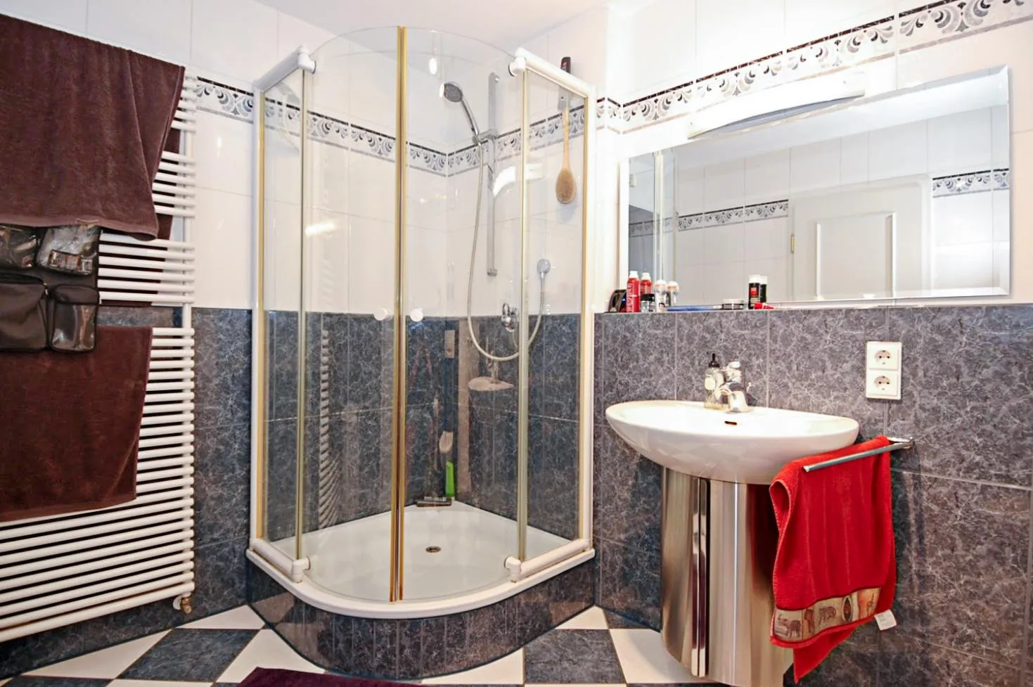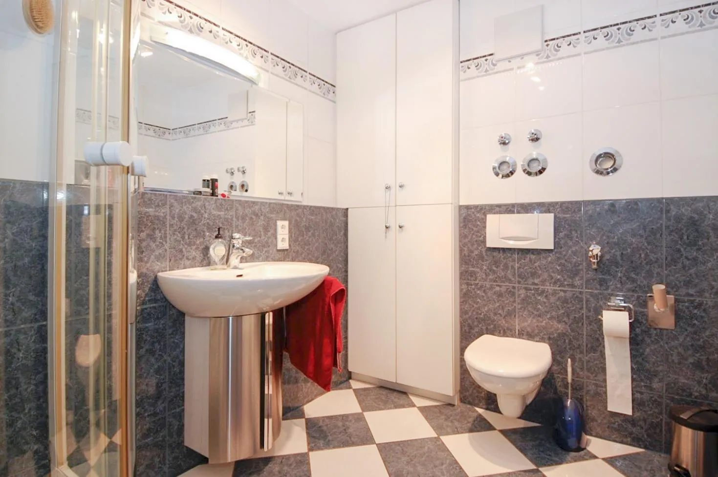 Das raumhoch, hochwertig geflieste Badezimmer ist mit einer Dusche, einem WC, einem Handtuchheizkörper, einem Waschmaschinenanschluss, einem Einbauschrank, einem Spiegel, einem Waschtisch-Unterschrank und einer Spiegellampe ausgestattet.