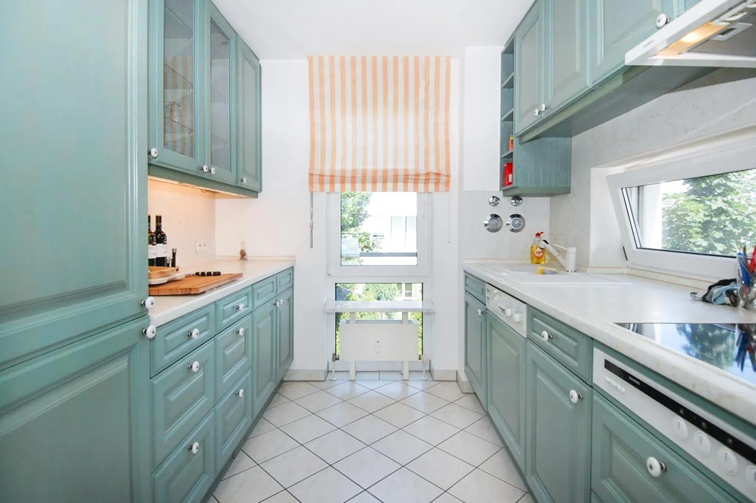 Die Küche ist mit einer Schiebetür und einer Einbauküche mit holzfurnierten, hell grünen Fronten ausgestattet. Die Einbauküche verfügt über einen Herd mit Backofen, einen Kühlschrank, einen Gefrierschrank, eine Spülmaschine, eine Dunstabzugshaube, Massivholz-Ober- und Unterschränke.