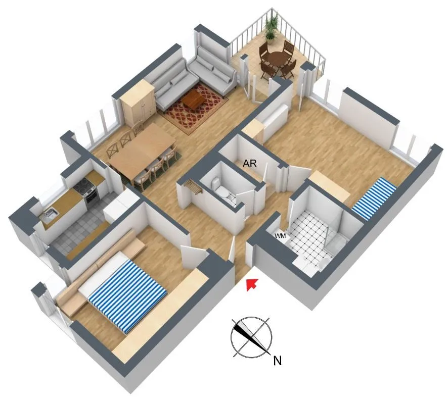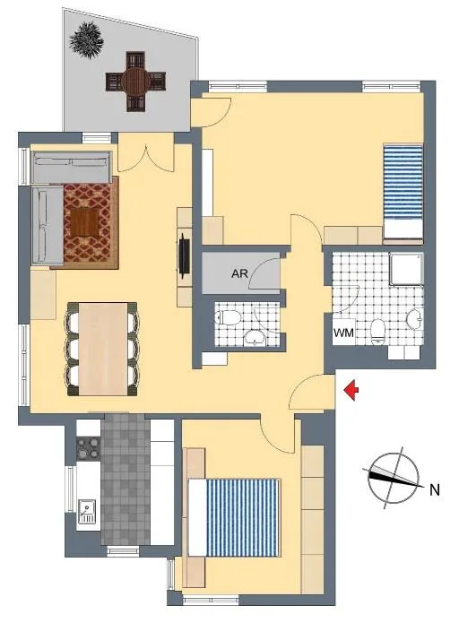 Der Grundriss der Wohnung ist gut. Alle Räume sind von der Diele/vom Flur aus begehbar. Die Wohnung verfügt über einen Balkon, einen zusätzlichen Abstellraum in der Wohnung sowie ein zweites, separates WC.