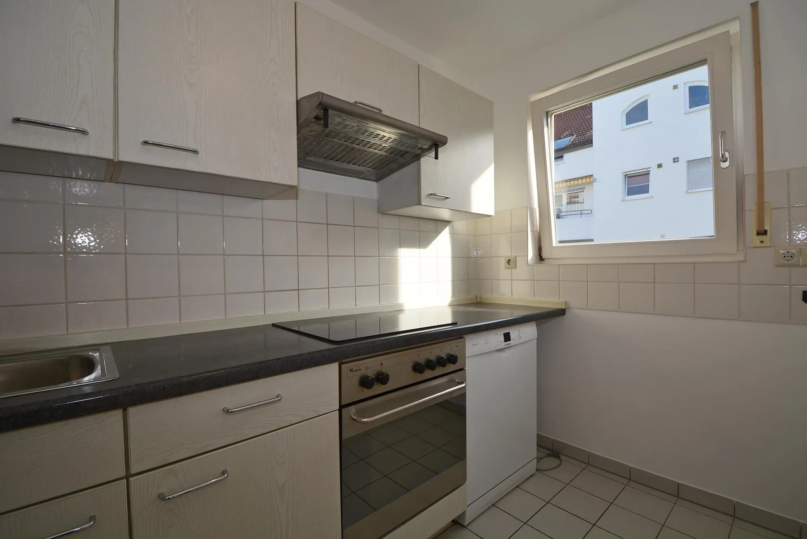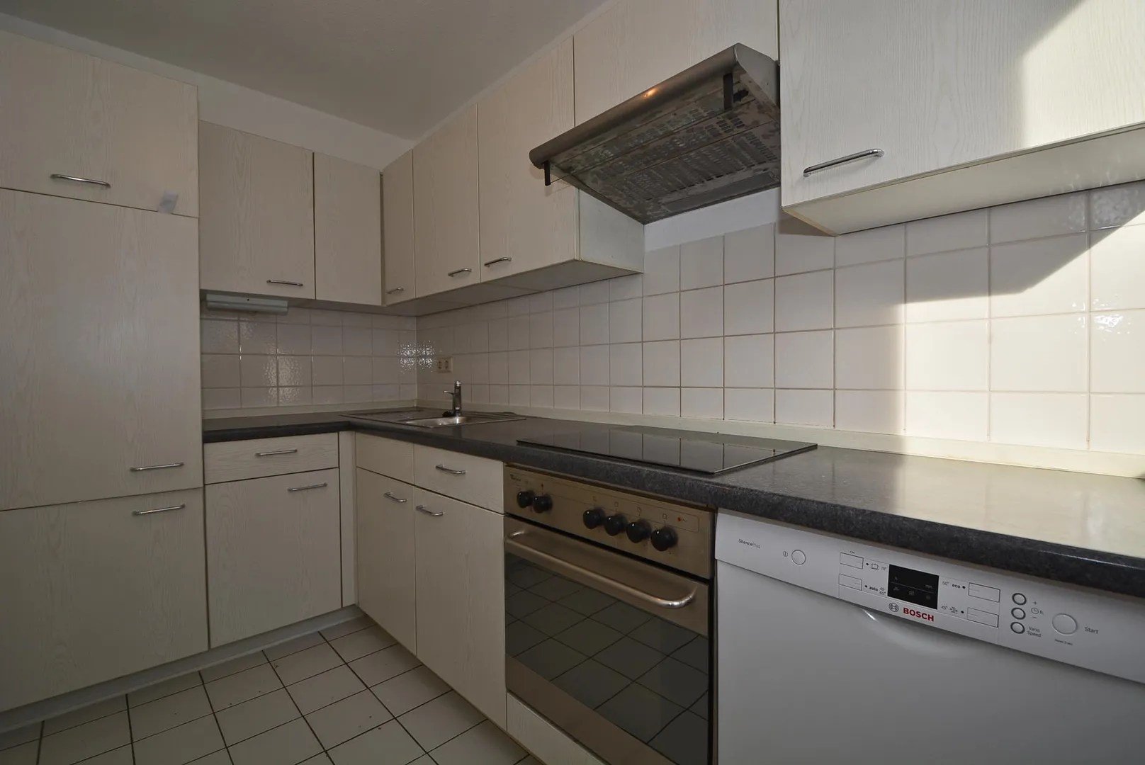 Die ältere Einbauküche ist mit einem Kühl-/Gefrierschrank, einer Spülmaschine, einem Herd mit Dunstabzug, einem Backofen sowie Ober- und Unterschränken ausgestattet.