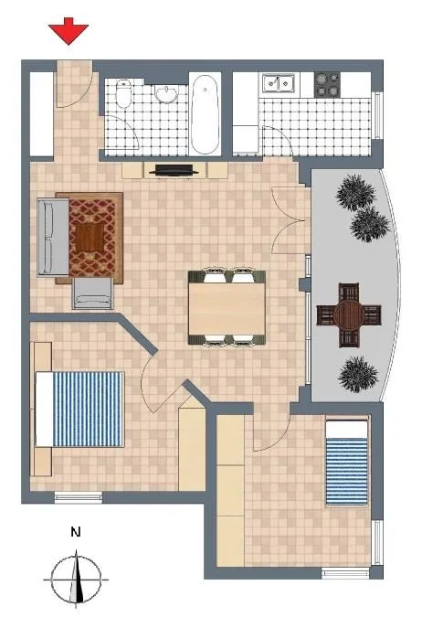 Das Wohnzimmer und die Küche sind nach Osten ausgerichtet. Das Kinderzimmer ist nach Süd-Osten ausgerichtet. Das Schlafzimmer ist nach Süden ausgerichtet.