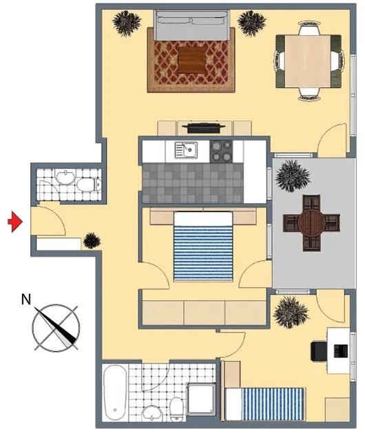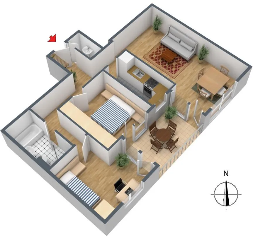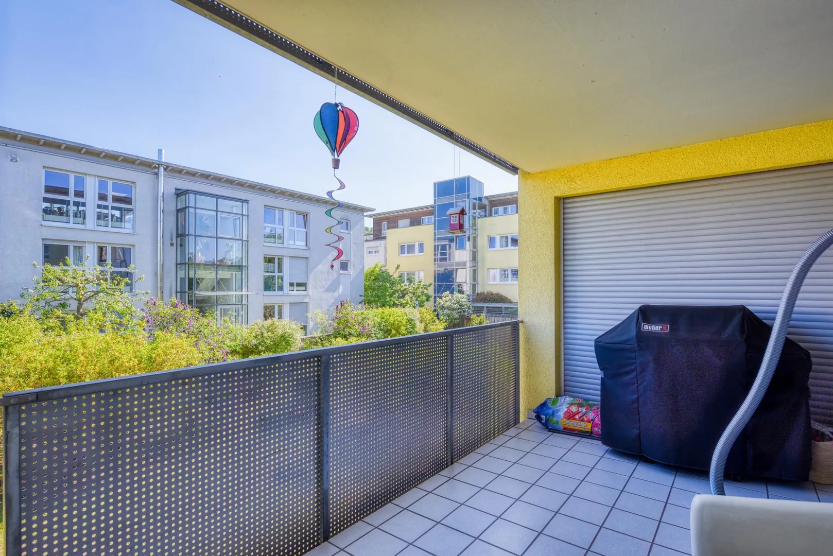Der Grundriss ist sehr gut. Alle Räume sind direkt vom Flur begehbar. Der ca. 10 m² große und überdachte Süd/Ost-Balkon ist von allen drei Zimmern begehbar. Das Badezimmer verfügt über ein WC. Ein zweites WC ist separat.