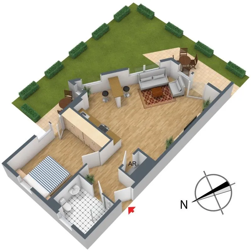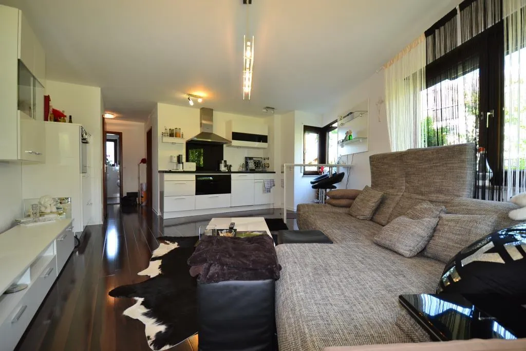 Diese schick modernisierte 2-Zimmer-Wohnung mit zwei Terrassen und Garten befindet sich im Hochparterre (Erdgeschoss).