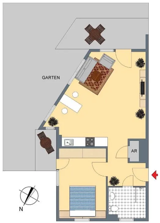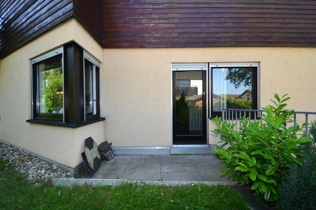 Die Wohnung ist nach Osten und Süden ausgerichtet. Vom Schlafzimmer gibt es einen Zugang zur Ost-Terrasse. Vom Wohnzimmer gibt es einen Zugang zur überdachten Süd-Terrasse.