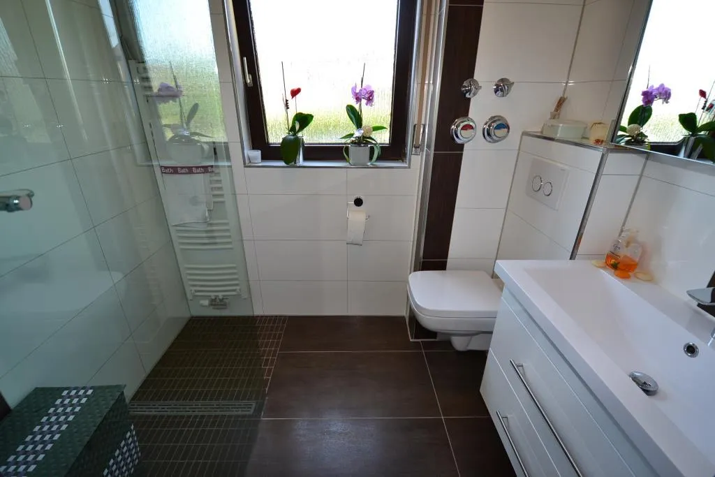 Das raumhoch geflieste Badezimmer mit Fenster ist ausgestattet mit einer bodentiefen, großen Dusche, einem Fliesenboden, einem WC sowie einem Handtuchheizkörper.