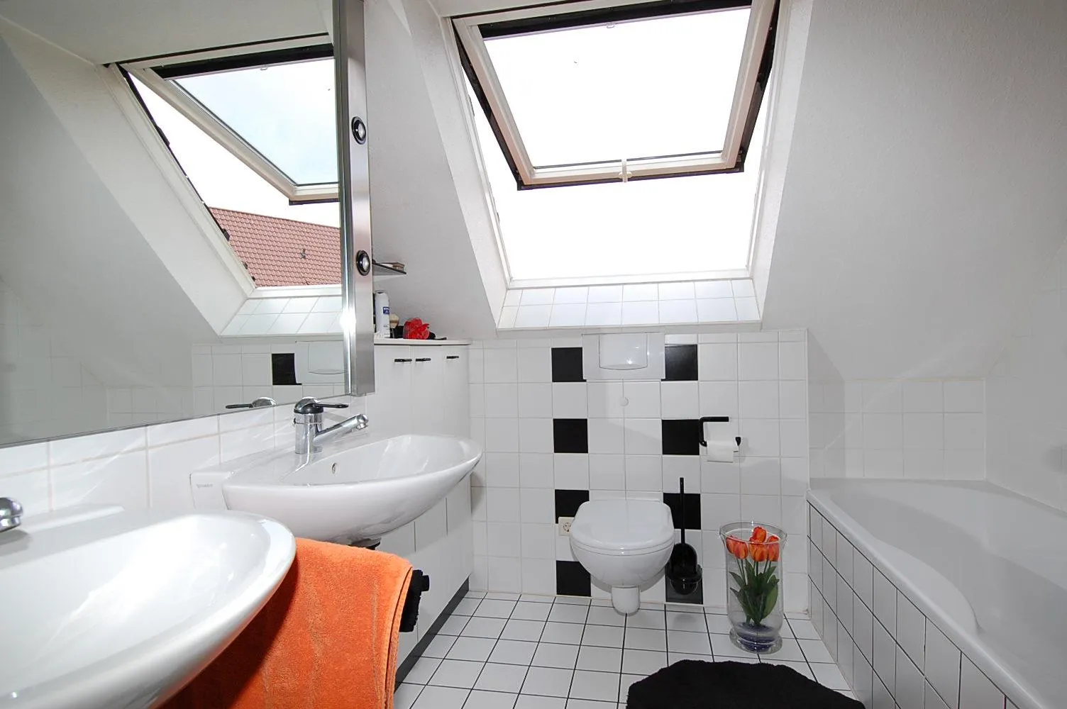 Das Badezimmer mit Fenster verfügt über eine Badewanne, eine Dusche und 2 Waschbecken. Das großzügige WC mit Fenster ist separat.