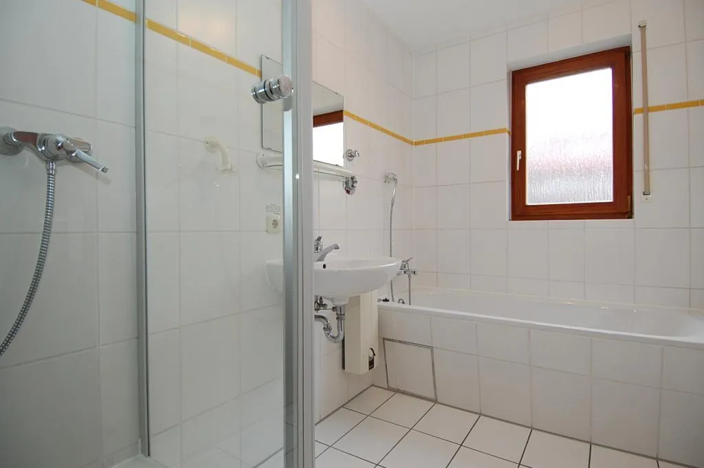 Das raumhoch geflieste Tageslicht-Badezimmer ist ausgestattet mit einer Wanne und einer Dusche. Die Silikonfugen sind neu. Die Duschkabine ist 2012 eingebaut worden.