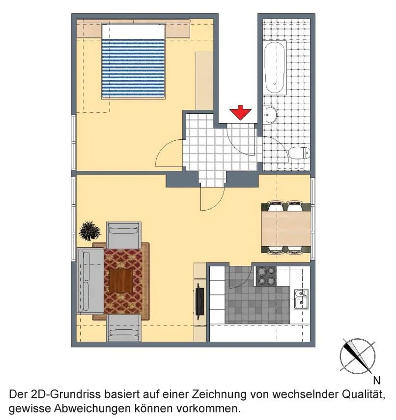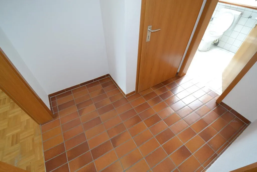 Die Böden im Flur, im Badezimmer und in der Küche sind gefliest.