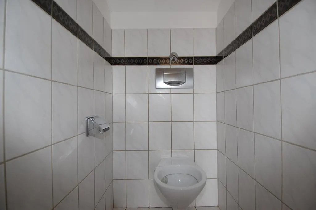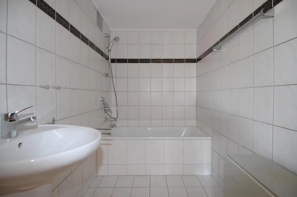 Das Badezimmer ist raumhoch gefliest. Es ist ausgestattet mit einer Wanne und einem Waschmaschinenanschluß.
