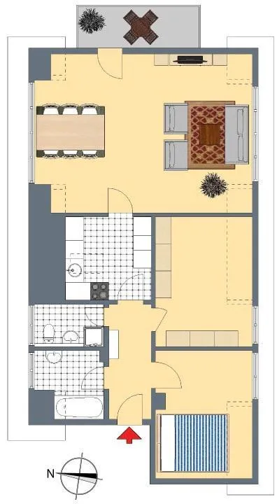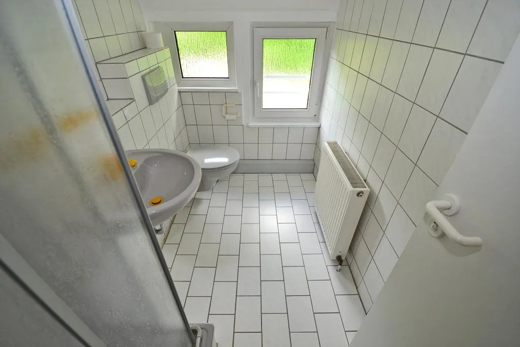 Die Wohnung verfügt über zwei Bäder. Beide Bäder sind mit Fenstern und WC ausgestattet. Das halbhoch geflieste Badezimmer verfügt über eine Badewanne. Das raumhoch geflieste Badezimmer verfügt über eine Dusche.