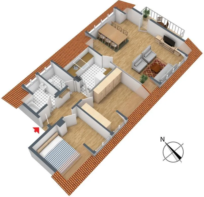 Die Böden in der Küche und in beiden Bädern sind gefliest.