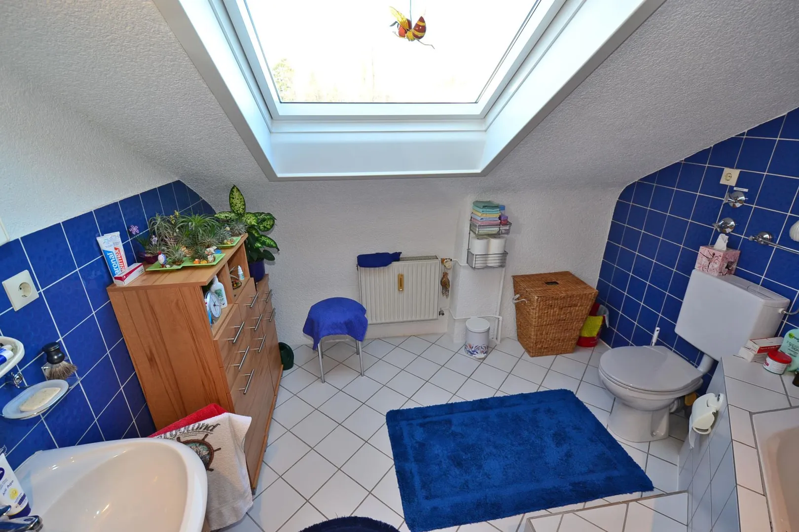 Das helle Badezimmer ist ausgestattet mit weißen Bodenfliesen, blauen Wandfliesen, Eck-Badewanne, Waschbecken, WC und Fenster.