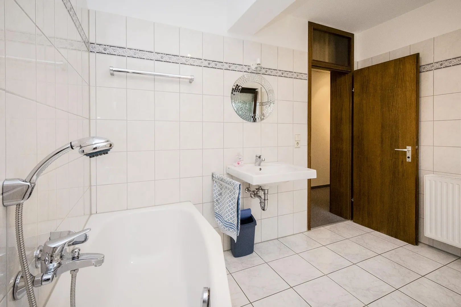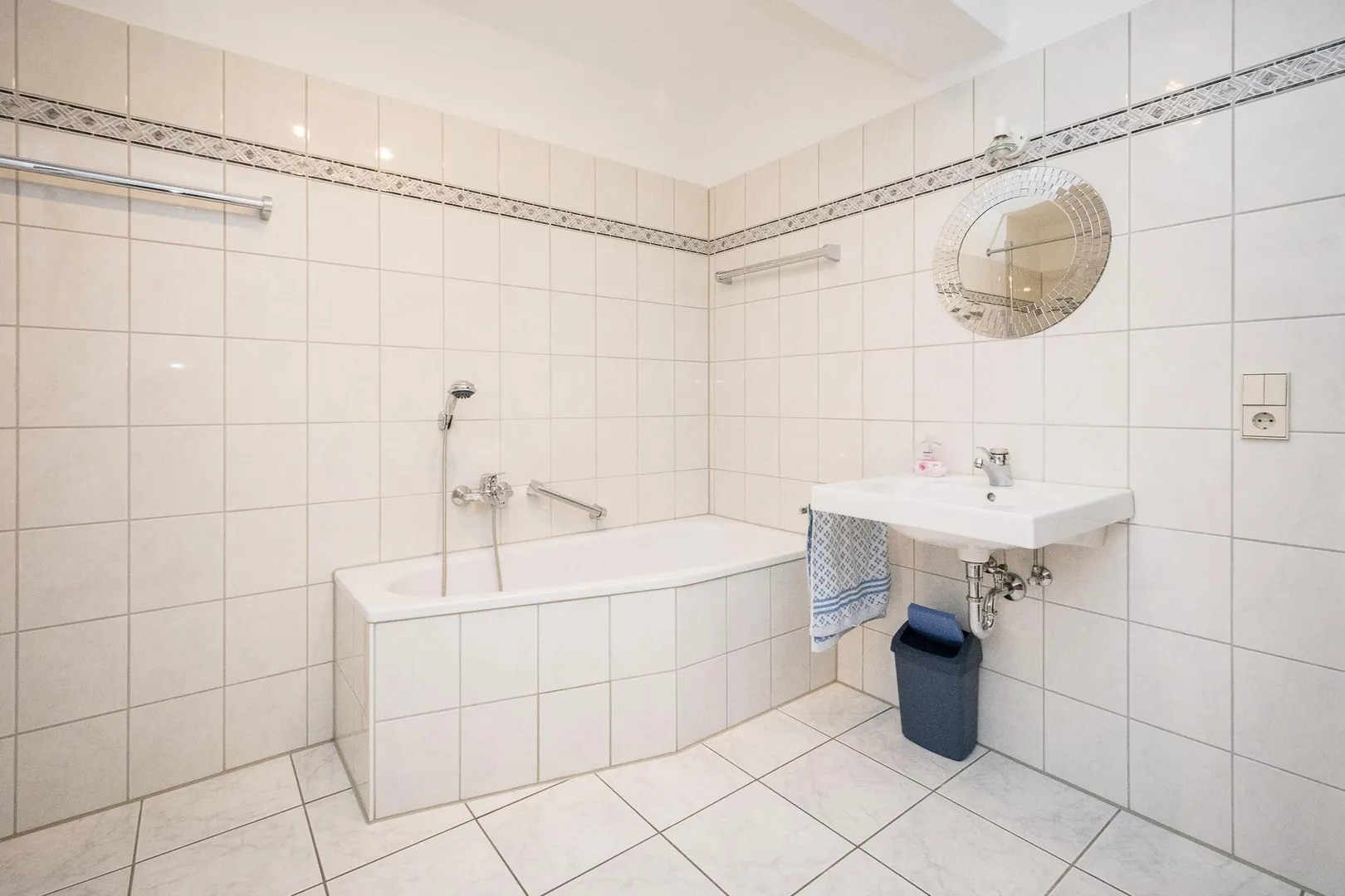 Das ¾ hoch geflieste Tageslicht-Badezimmer ist mit einer Badewanne, einer Dusche, einem WC, einem Waschbecken mit Spiegel sowie einem Waschmaschinenanschluss ausgestattet.