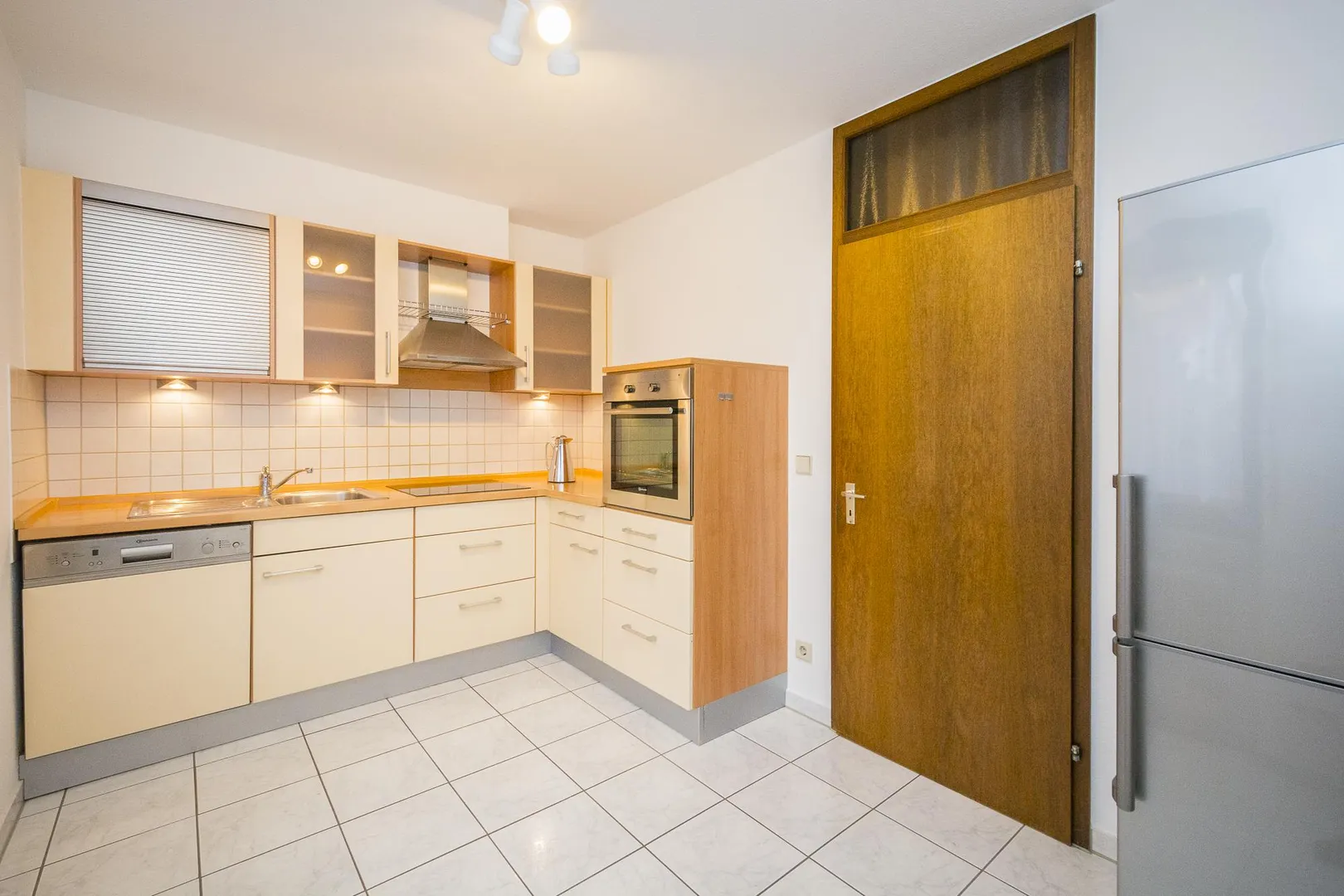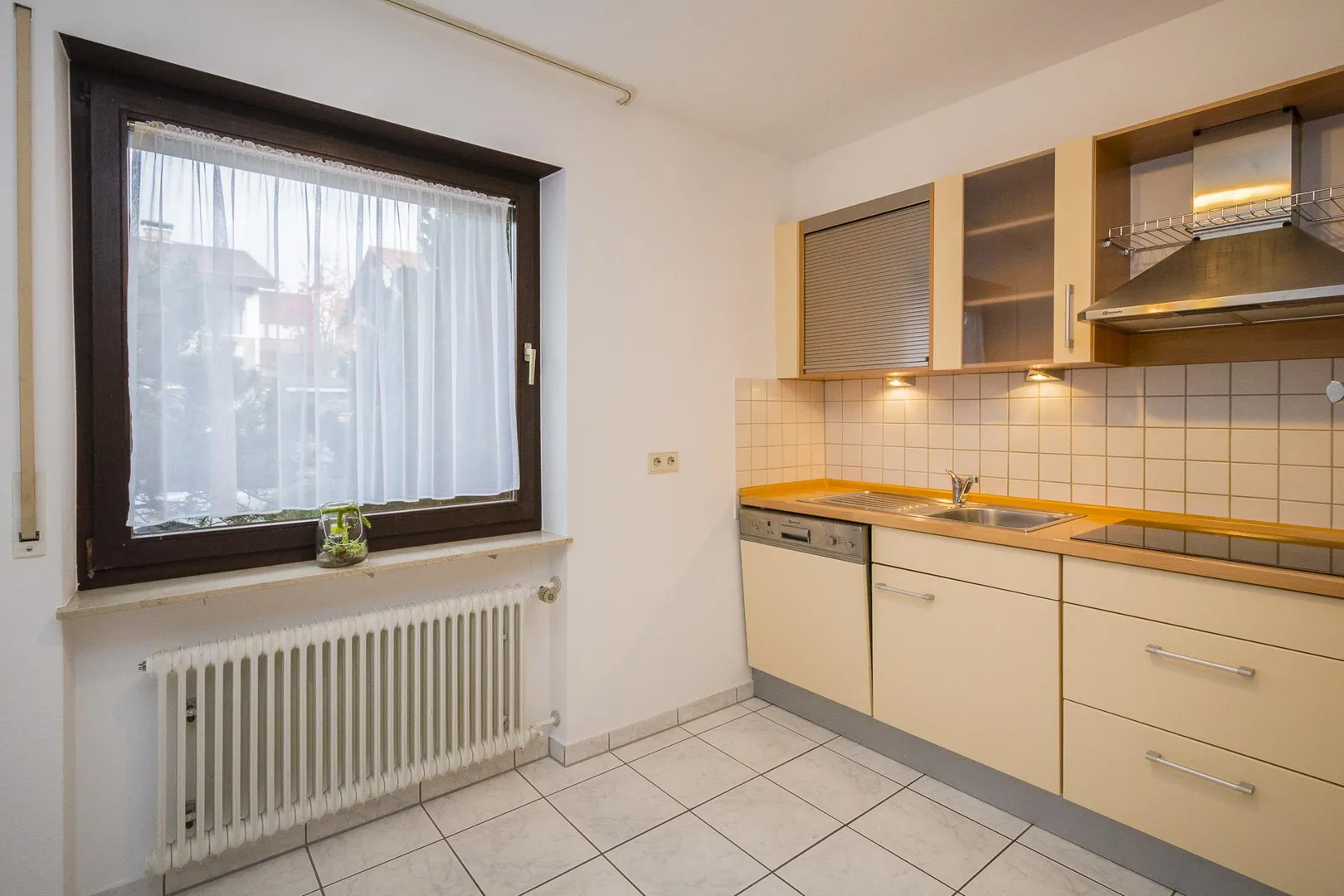 Die Küche verfügt über eine Einbauküche. Die Einbauküche beinhaltet einen Kühlschrank mit Gefrierfach, eine Spülmaschine, einen Ceran-Herd, einen Backofen, einen Außen-Dunstabzug sowie Ober- und Unterschränke. Die vorhandenen E-Geräte sind funktionsfähig. Für die künftige Funktionsfähigkeit der E-Geräte übernimmt der Vermieter keine Haftung.